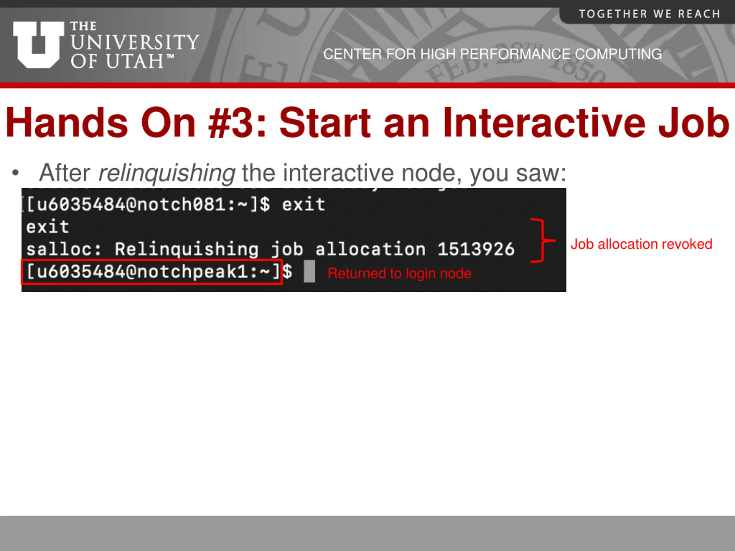 CENTER FOR HIGH PERFORMANCE COMPUTING Hands On #3: Start an Interactive Job After relinquishing the interactive node, you saw: Job allocation revoked Returned to login node