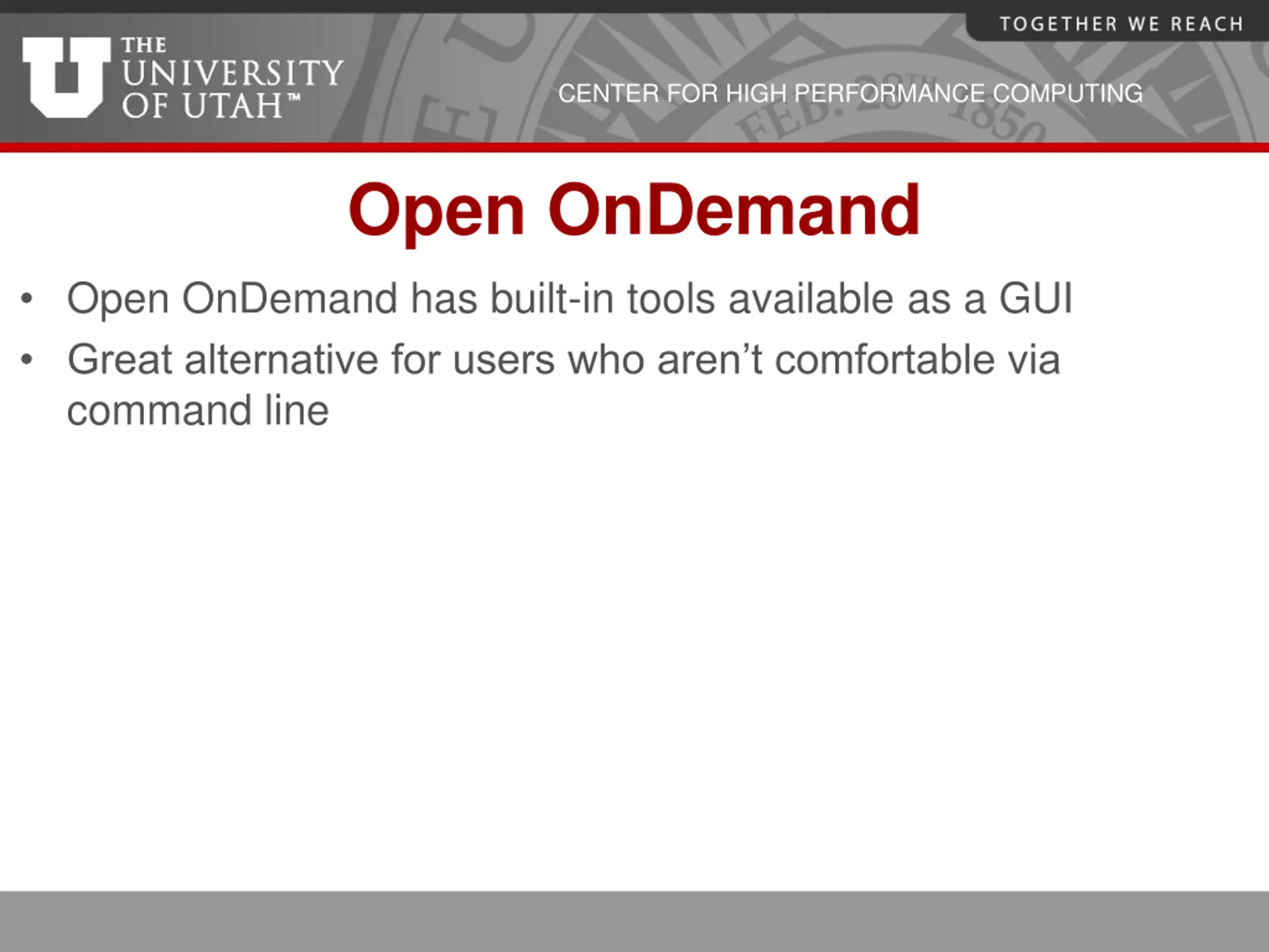 CENTER FOR HIGH PERFORMANCE COMPUTING Open OnDemand Open OnDemand has built-in tools available as a GUI Great alternative for users who aren t comfortable via command line