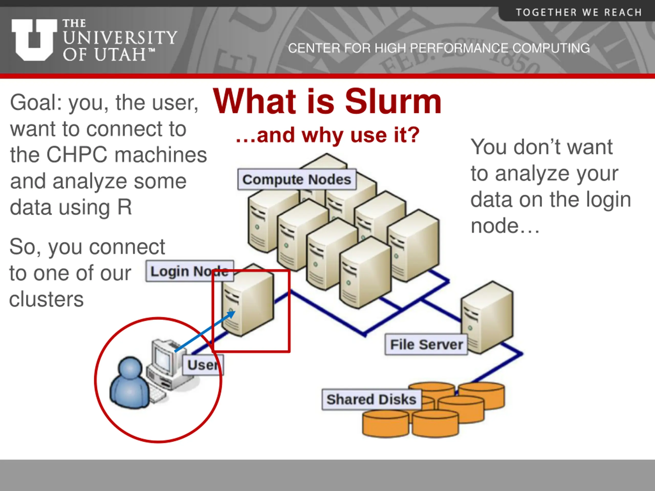 CENTER FOR HIGH PERFORMANCE COMPUTING What is Slurm and why use it? Goal: you, the user, want to connect to the CHPC machines and analyze some data using R You don t want to analyze your data on the login node So, you connect to one of our clusters