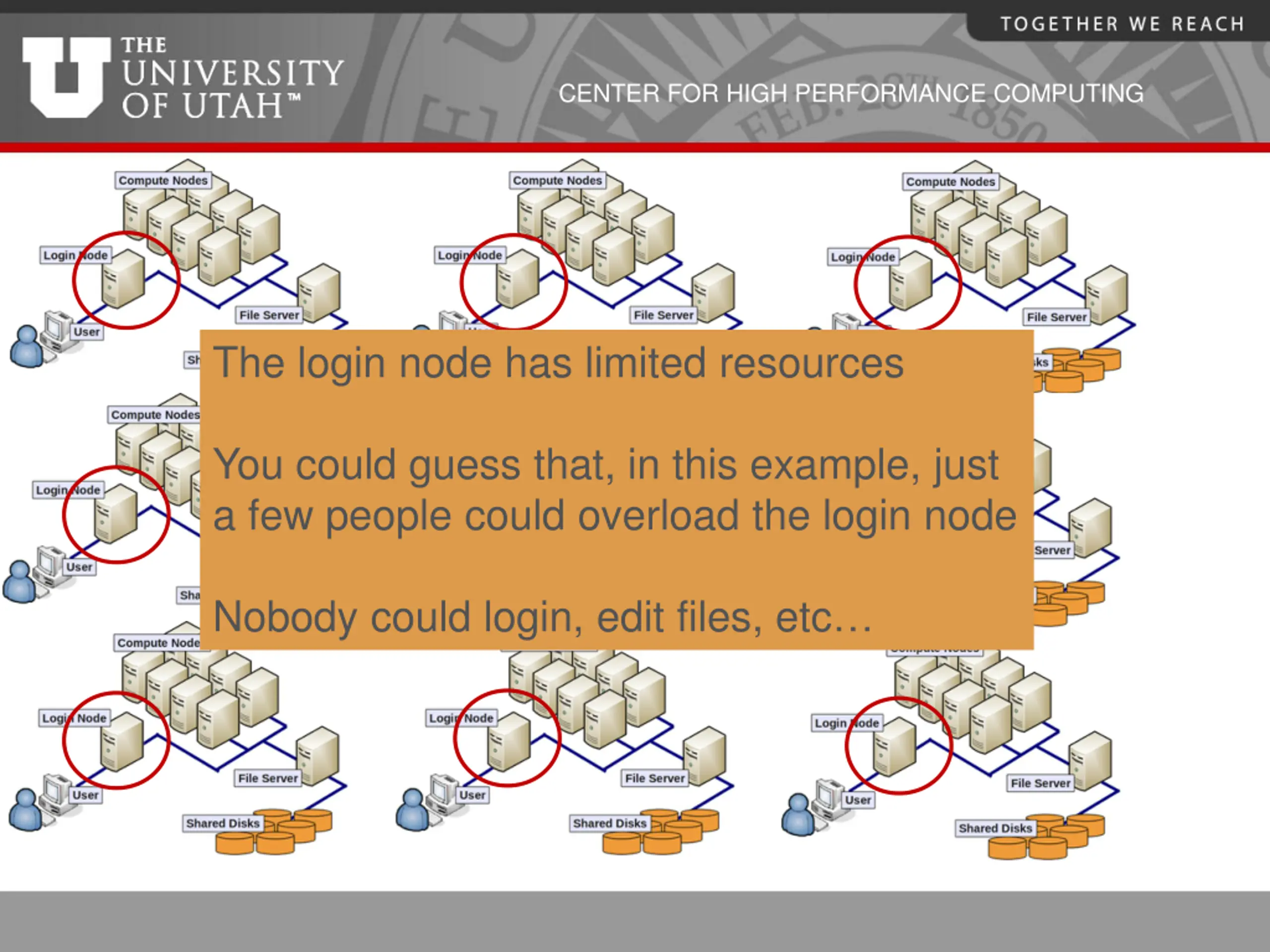 CENTER FOR HIGH PERFORMANCE COMPUTING The login node has limited resources You could guess that, in this example, just a few people could overload the login node Nobody could login, edit files, etc