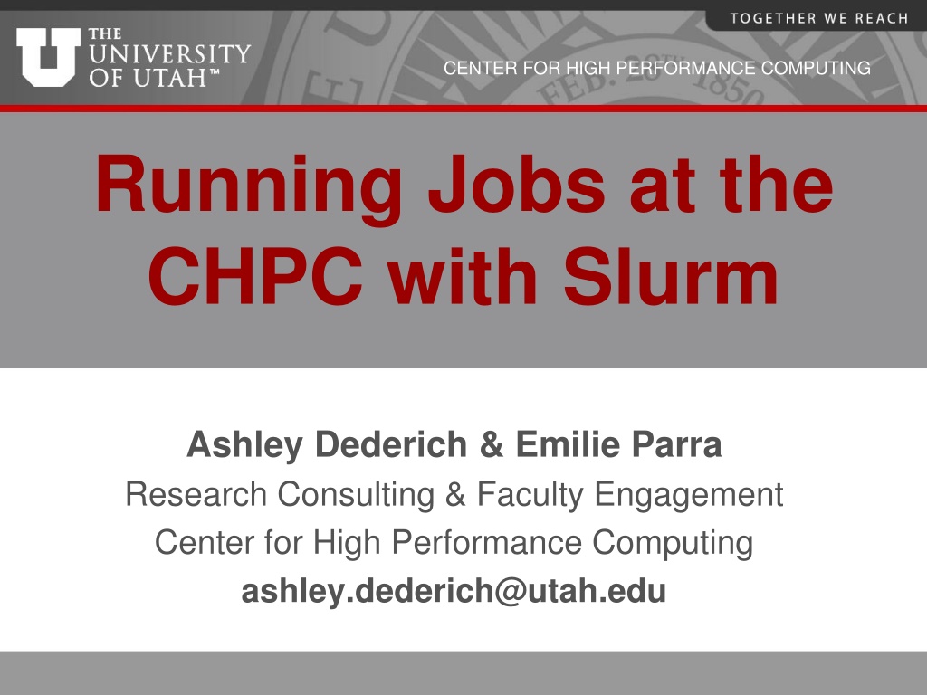 CENTER FOR HIGH PERFORMANCE COMPUTING Running Jobs at the CHPC with Slurm Ashley Dederich & Emilie Parra Research Consulting & Faculty Engagement Center for High Performance Computing ashley.dederich@utah.edu