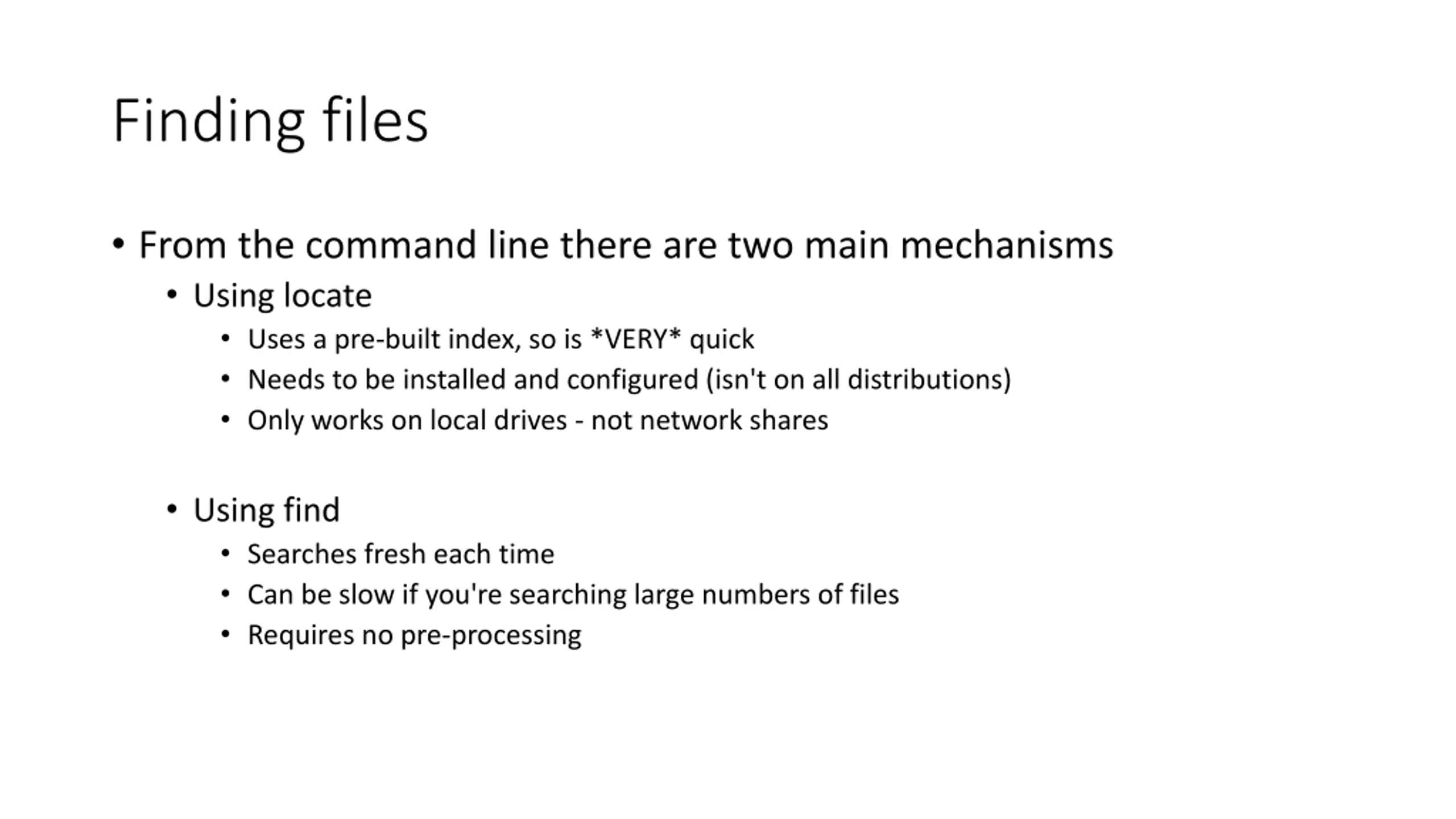 Finding files From the command line there are two main mechanisms Using locate Uses a pre-built index, so is *VERY* quick Needs to be installed and configured (isn't on all distributions) Only works on local drives - not network shares Using find Searches fresh each time Can be slow if you're searching large numbers of files Requires no pre-processing