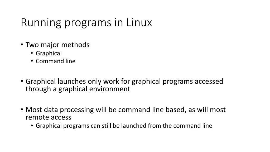 Running programs in Linux Two major methods Graphical Command line Graphical launches only work for graphical programs accessed through a graphical environment Most data processing will be command line based, as will most remote access Graphical programs can still be launched from the command line