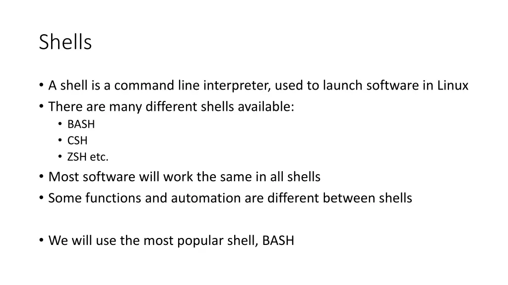 Shells A shell is a command line interpreter, used to launch software in Linux There are many different shells available: BASH CSH ZSH etc. Most software will work the same in all shells Some functions and automation are different between shells We will use the most popular shell, BASH