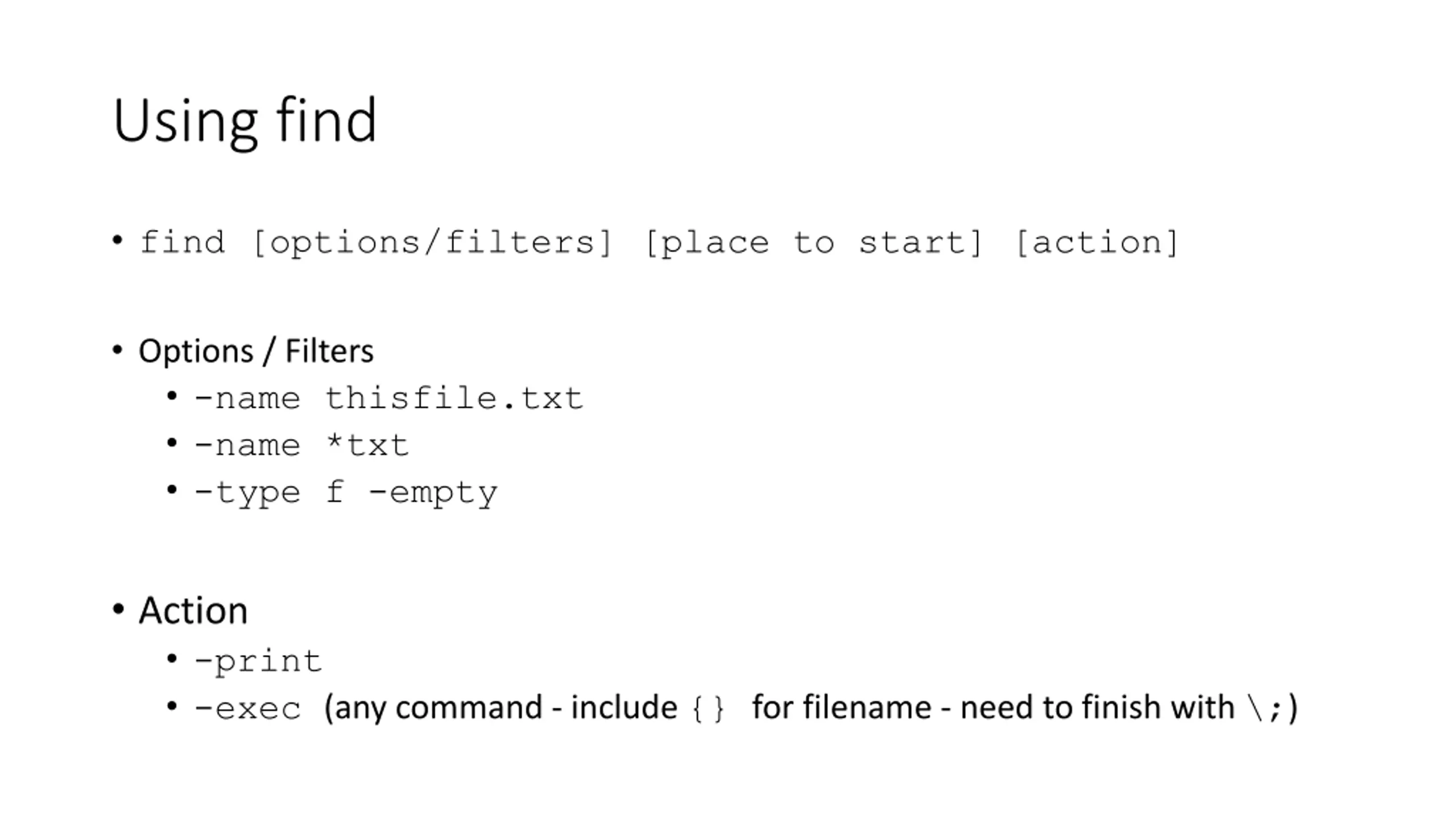 Using find find [options/filters] [place to start] [action] Options / Filters -name thisfile.txt -name *txt -type f -empty Action -print -exec (any command - include {} for filename - need to finish with \;)