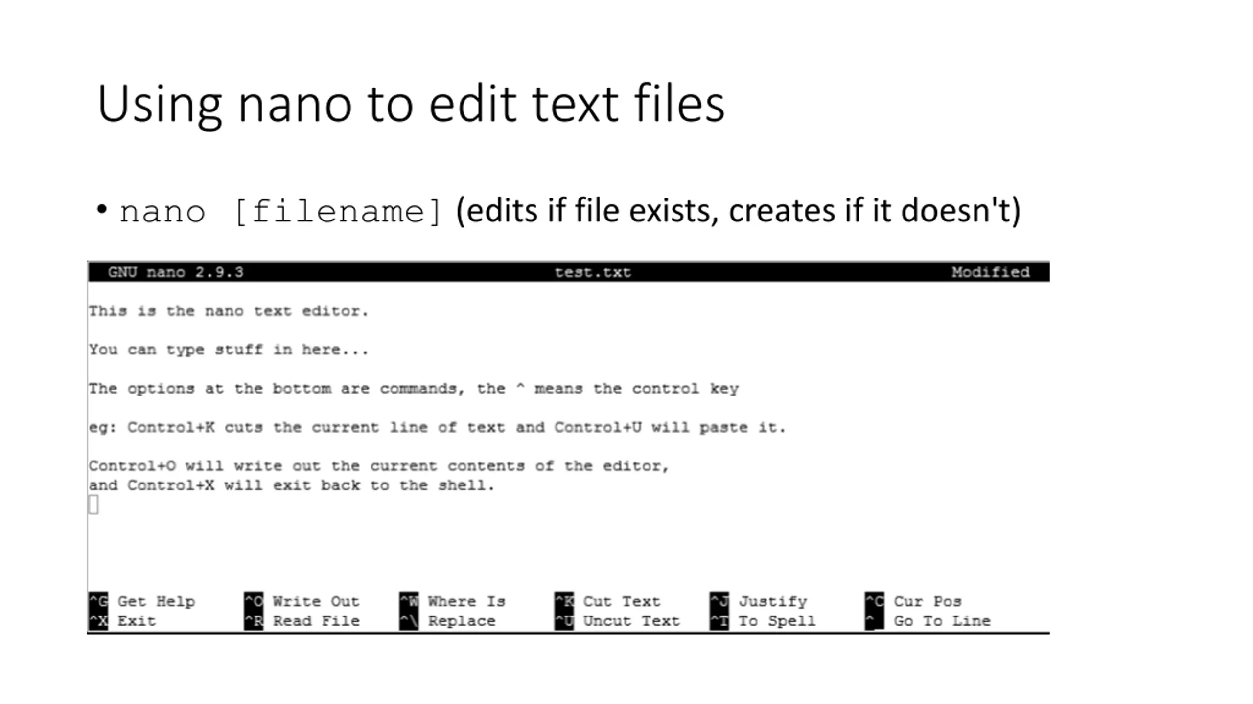 Using nano to edit text files nano [filename] (edits if file exists, creates if it doesn't)
