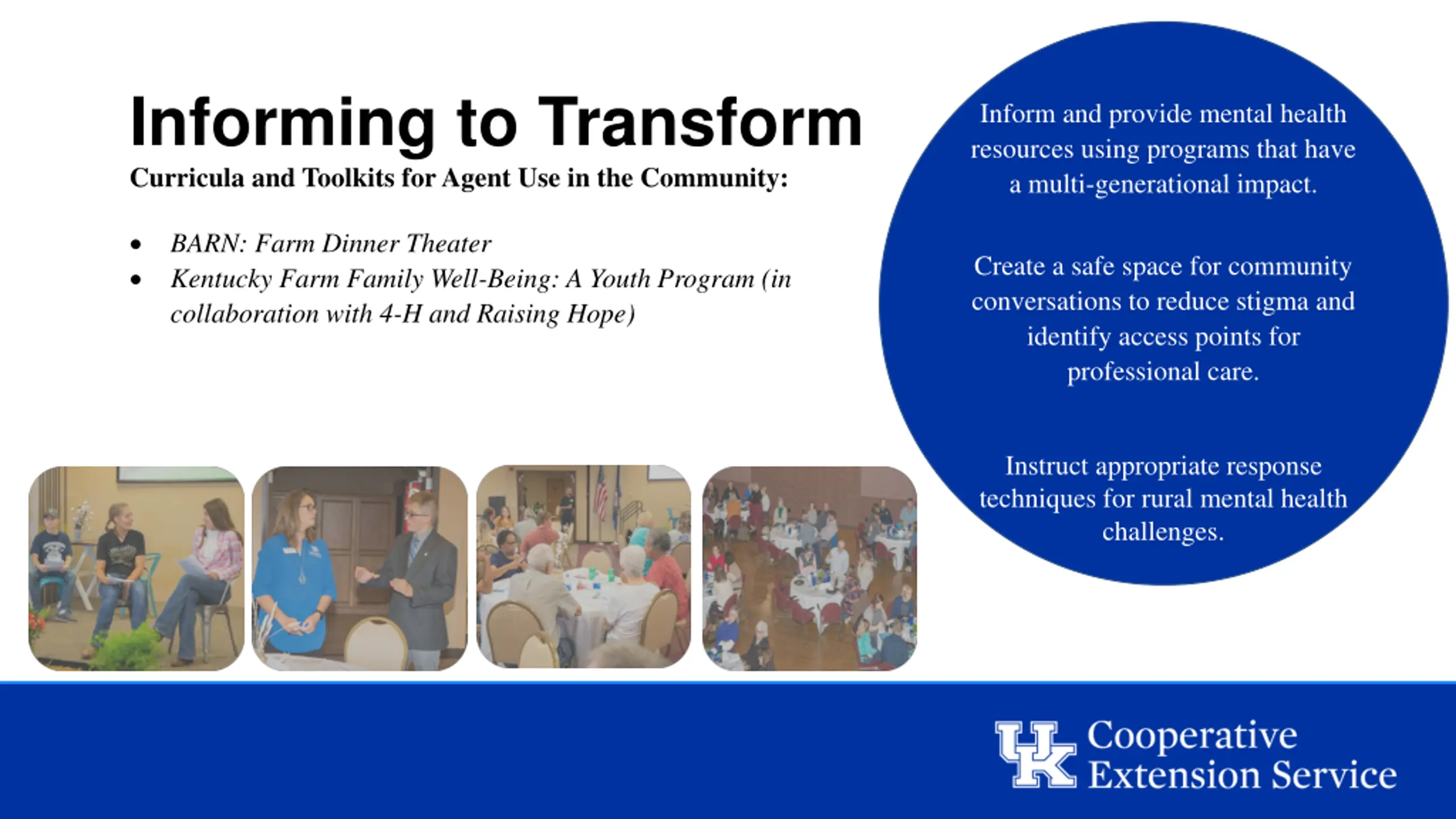 - Informing to Transform Curricula and Toolkits for Agent Use in the Community: Inform and provide mental health resources using programs that have a multi-generational impact. BARN: Farm Dinner Theater Kentucky Farm Family Well-Being: A Youth Program (in collaboration with 4-H and Raising Hope) Create a safe space for community conversations to reduce stigma and identify access points for professional care. Instruct appropriate response techniques for rural mental health challenges.