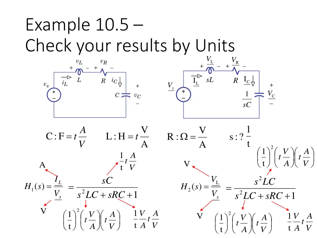 Example 10.5 Check your results by Units V V L R C I sL LI R s V V 1 C sC 1 V A V = = = C : F L : H t t R : ? : s t A V A 2 1 V A 1 A t t t t A V V A t V I V sC 2 s LC L L = = = ( ) H s = ( ) H s 1 2 + + V 2 s V 1 s LC sRC + + 2 1 s LC sRC s V 2 1 V A 1 V A 2 1 V A V 1 V A t t t t t t t A V t A V t A V t A V