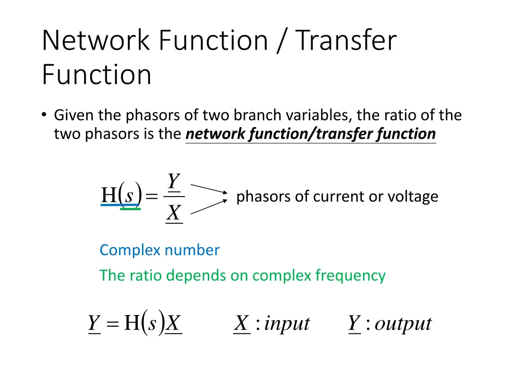 Network Function / Transfer Function Given the phasors of two branch variables, the ratio of the two phasors is the network function/transfer function Y ( ) s = H phasors of current or voltage X Complex number The ratio depends on complex frequency ( )X s = H X : Y : Y input output