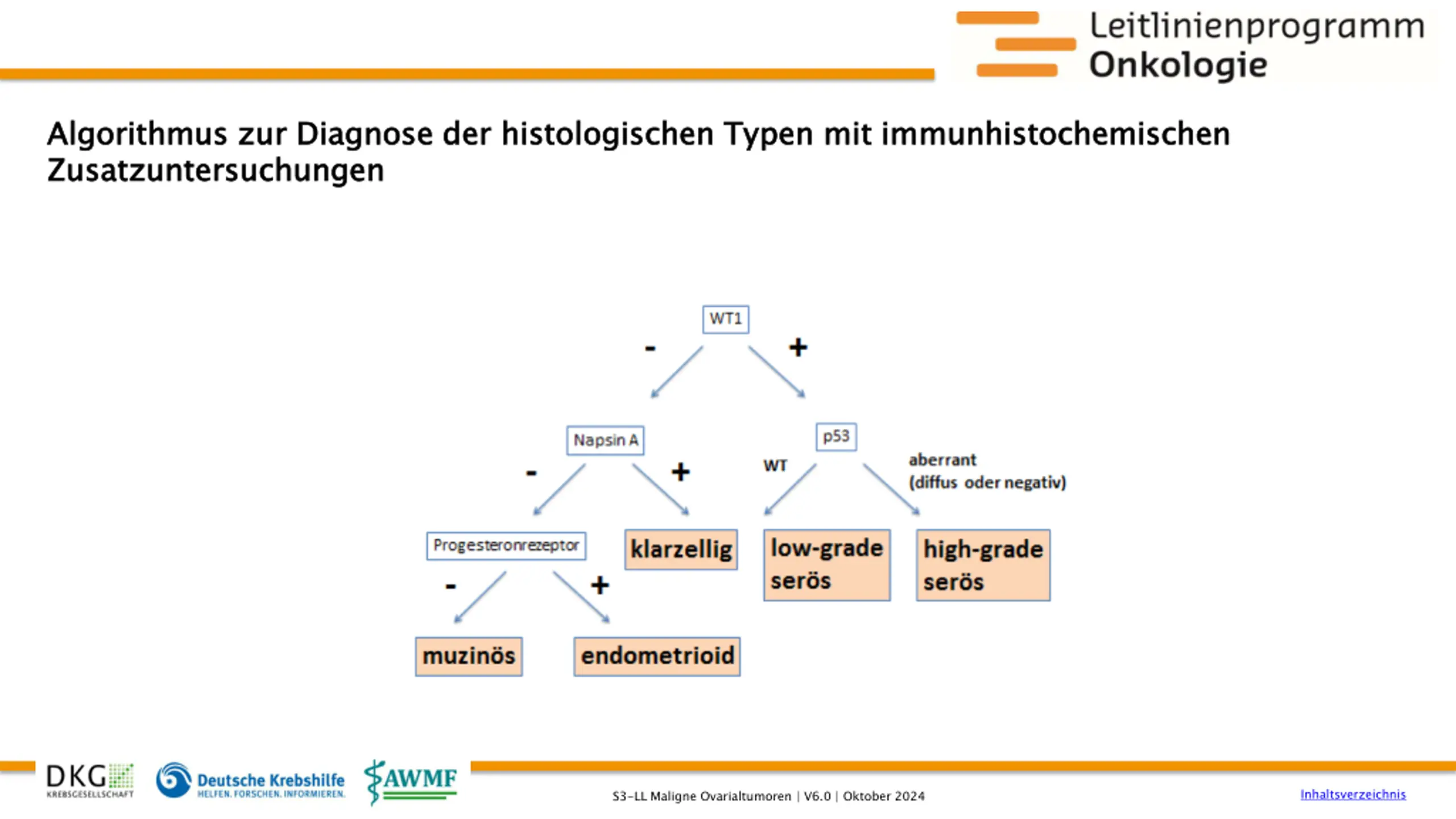 Algorithmus zur Diagnose der histologischen Typen mit immunhistochemischen Zusatzuntersuchungen Algorithmus zur Diagnose der histologischen Typen mit immunhistochemischen Zusatzuntersuchungen Inhaltsverzeichnis S3-LL Maligne Ovarialtumoren | V6.0 | Oktober 2024