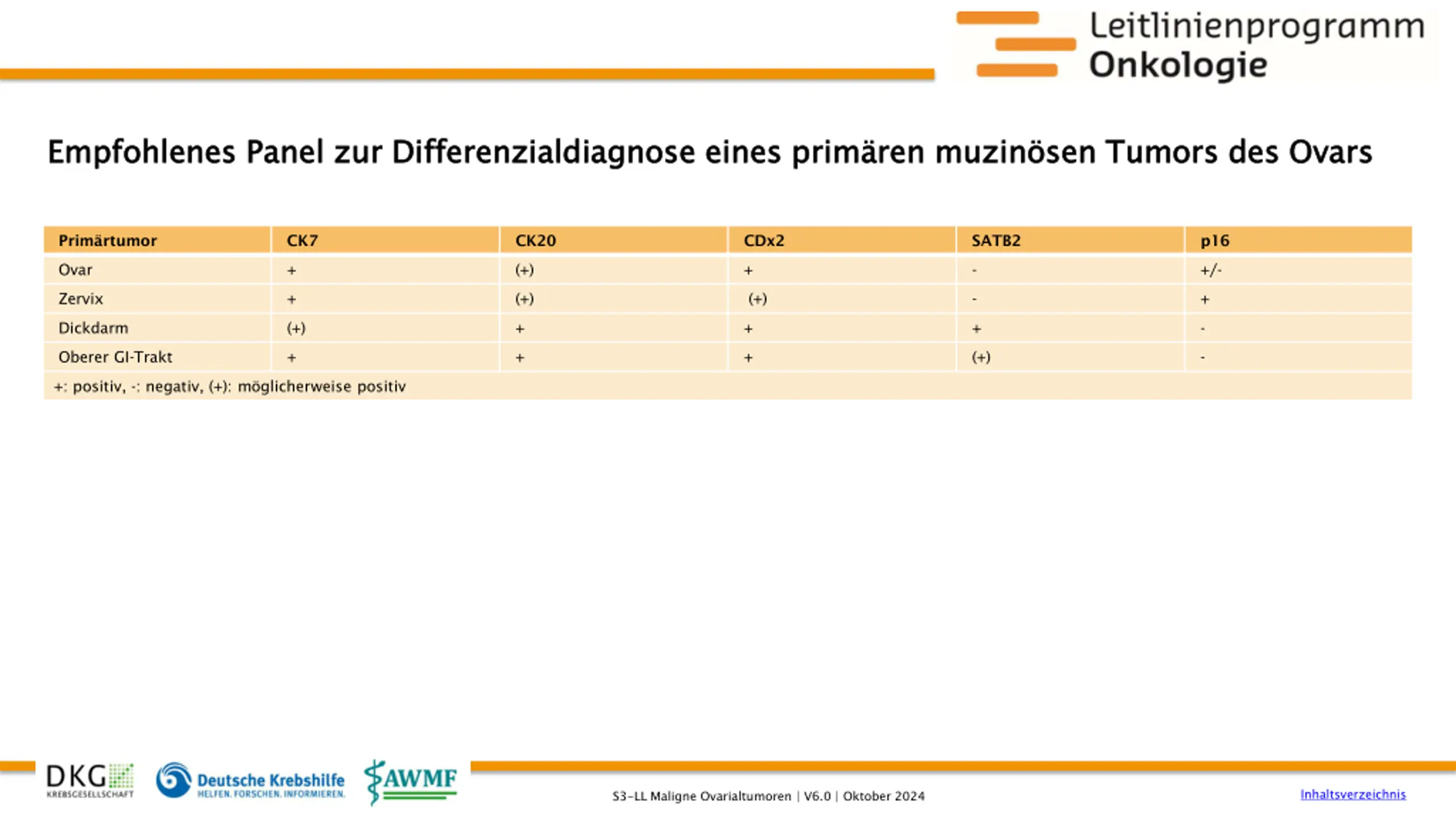 Empfohlenes Panel zur Differenzialdiagnose eines primren muzinsen Tumors des Ovars Empfohlenes Panel zur Differenzialdiagnose eines prim ren muzin sen Tumors des Ovars Prim rtumor CK7 CK20 CDx2 SATB2 p16 Ovar + (+) + - +/- Zervix + (+) (+) - + Dickdarm (+) + + + - Oberer GI-Trakt + + + (+) - +: positiv, -: negativ, (+): m glicherweise positiv Inhaltsverzeichnis S3-LL Maligne Ovarialtumoren | V6.0 | Oktober 2024