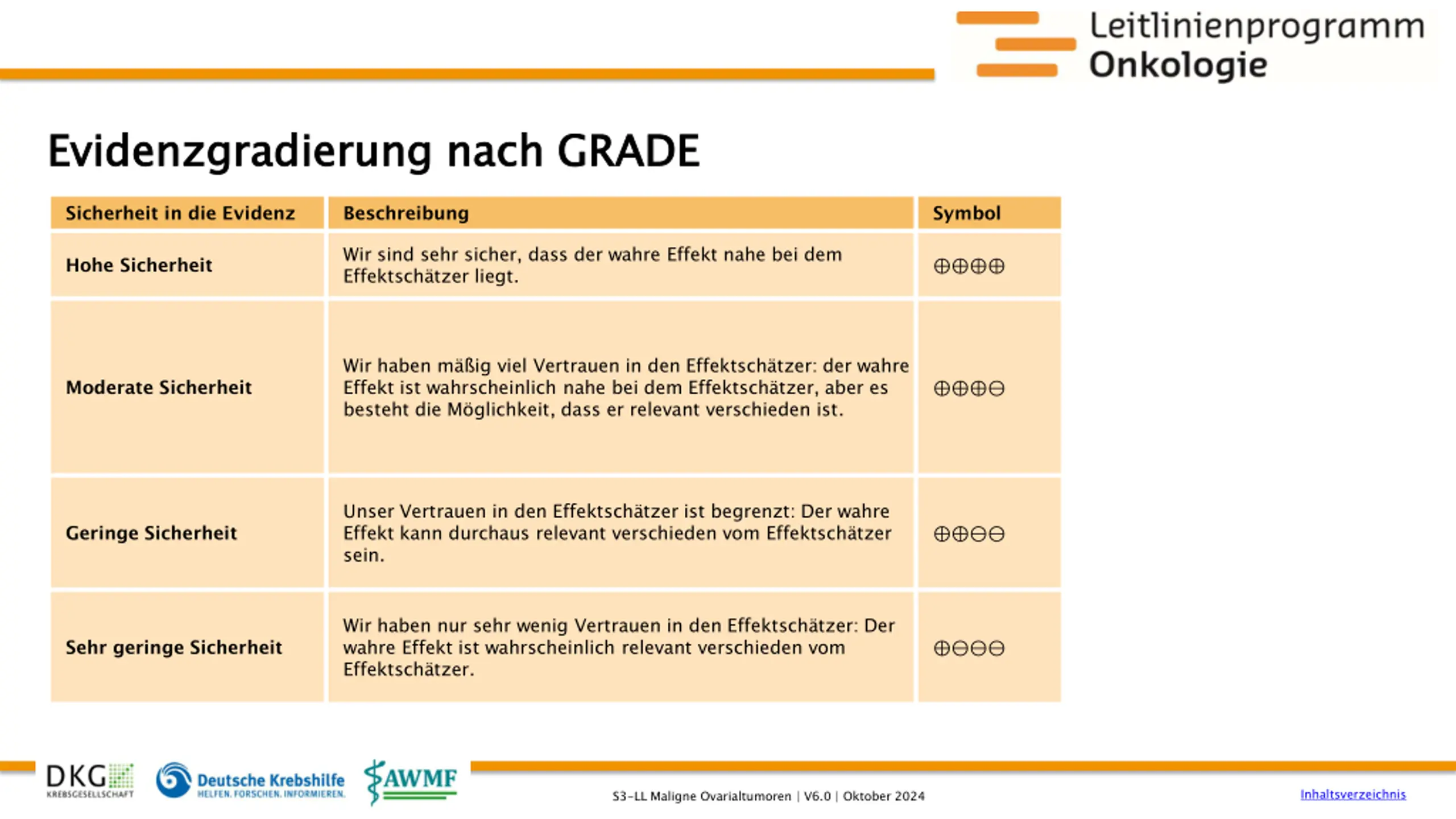 Evidenzgradierung nach GRADE Evidenzgradierung nach GRADE Sicherheit in die Evidenz Beschreibung Symbol Wir sind sehr sicher, dass der wahre Effekt nahe bei dem Effektsch tzer liegt. Hohe Sicherheit Wir haben m ig viel Vertrauen in den Effektsch tzer: der wahre Effekt ist wahrscheinlich nahe bei dem Effektsch tzer, aber es besteht die M glichkeit, dass er relevant verschieden ist. Moderate Sicherheit Unser Vertrauen in den Effektsch tzer ist begrenzt: Der wahre Effekt kann durchaus relevant verschieden vom Effektsch tzer sein. Geringe Sicherheit Wir haben nur sehr wenig Vertrauen in den Effektsch tzer: Der wahre Effekt ist wahrscheinlich relevant verschieden vom Effektsch tzer. Sehr geringe Sicherheit Inhaltsverzeichnis S3-LL Maligne Ovarialtumoren | V6.0 | Oktober 2024