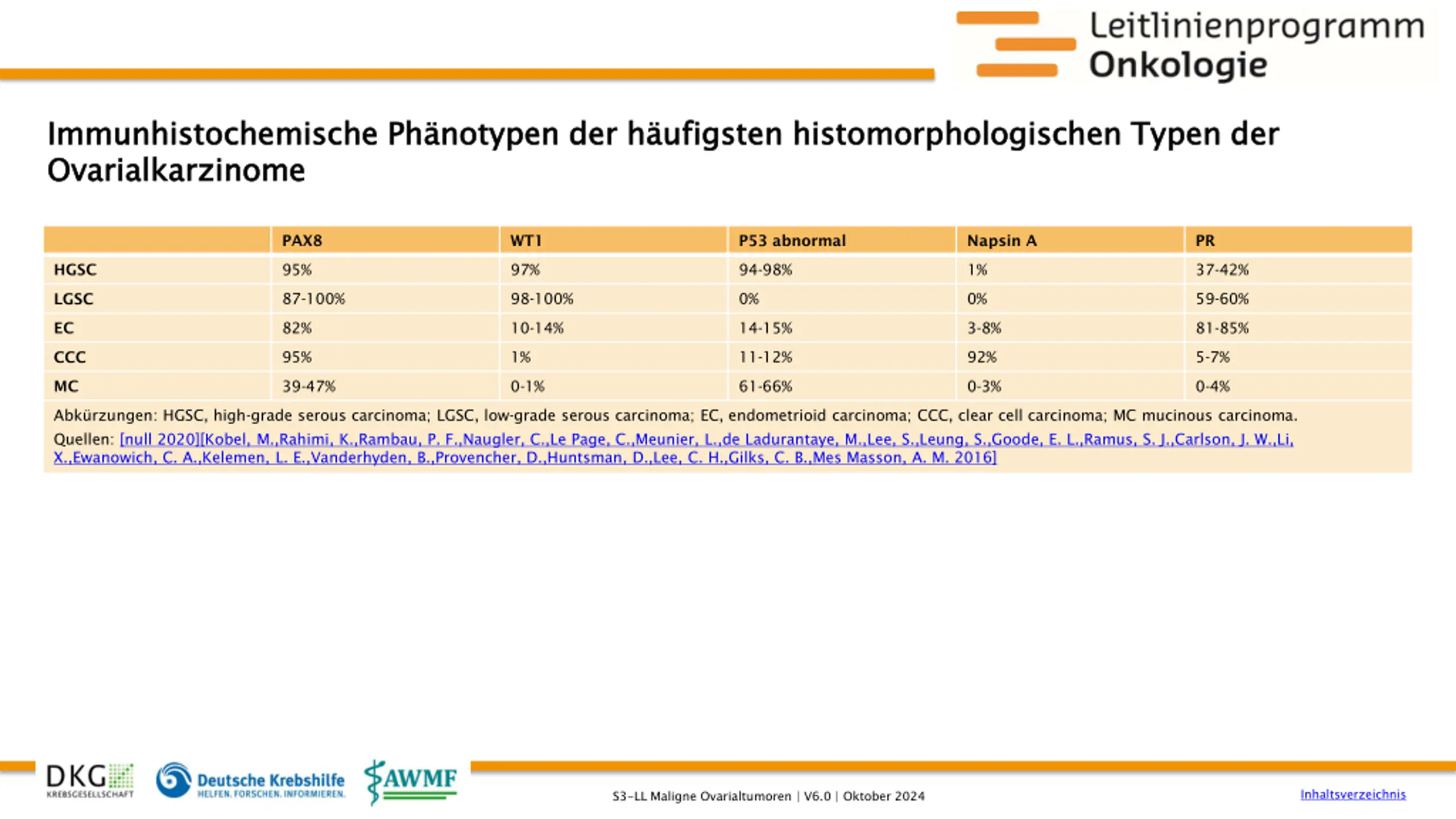 Immunhistochemische Phnotypen der hufigsten histomorphologischen Typen der Ovarialkarzinome Immunhistochemische Ph notypen der h ufigsten histomorphologischen Typen der Ovarialkarzinome PAX8 WT1 P53 abnormal Napsin A PR 95% 97% 94-98% 1% 37-42% HGSC 87-100% 98-100% 0% 0% 59-60% LGSC 82% 10-14% 14-15% 3-8% 81-85% EC 95% 1% 11-12% 92% 5-7% CCC 39-47% 0-1% 61-66% 0-3% 0-4% MC Abk rzungen: HGSC, high-grade serous carcinoma; LGSC, low-grade serous carcinoma; EC, endometrioid carcinoma; CCC, clear cell carcinoma; MC mucinous carcinoma. Quellen: [null 2020][Kobel, M.,Rahimi, K.,Rambau, P. F.,Naugler, C.,Le Page, C.,Meunier, L.,de Ladurantaye, M.,Lee, S.,Leung, S.,Goode, E. L.,Ramus, S. J.,Carlson, J. W.,Li, X.,Ewanowich, C. A.,Kelemen, L. E.,Vanderhyden, B.,Provencher, D.,Huntsman, D.,Lee, C. H.,Gilks, C. B.,Mes Masson, A. M. 2016] Inhaltsverzeichnis S3-LL Maligne Ovarialtumoren | V6.0 | Oktober 2024