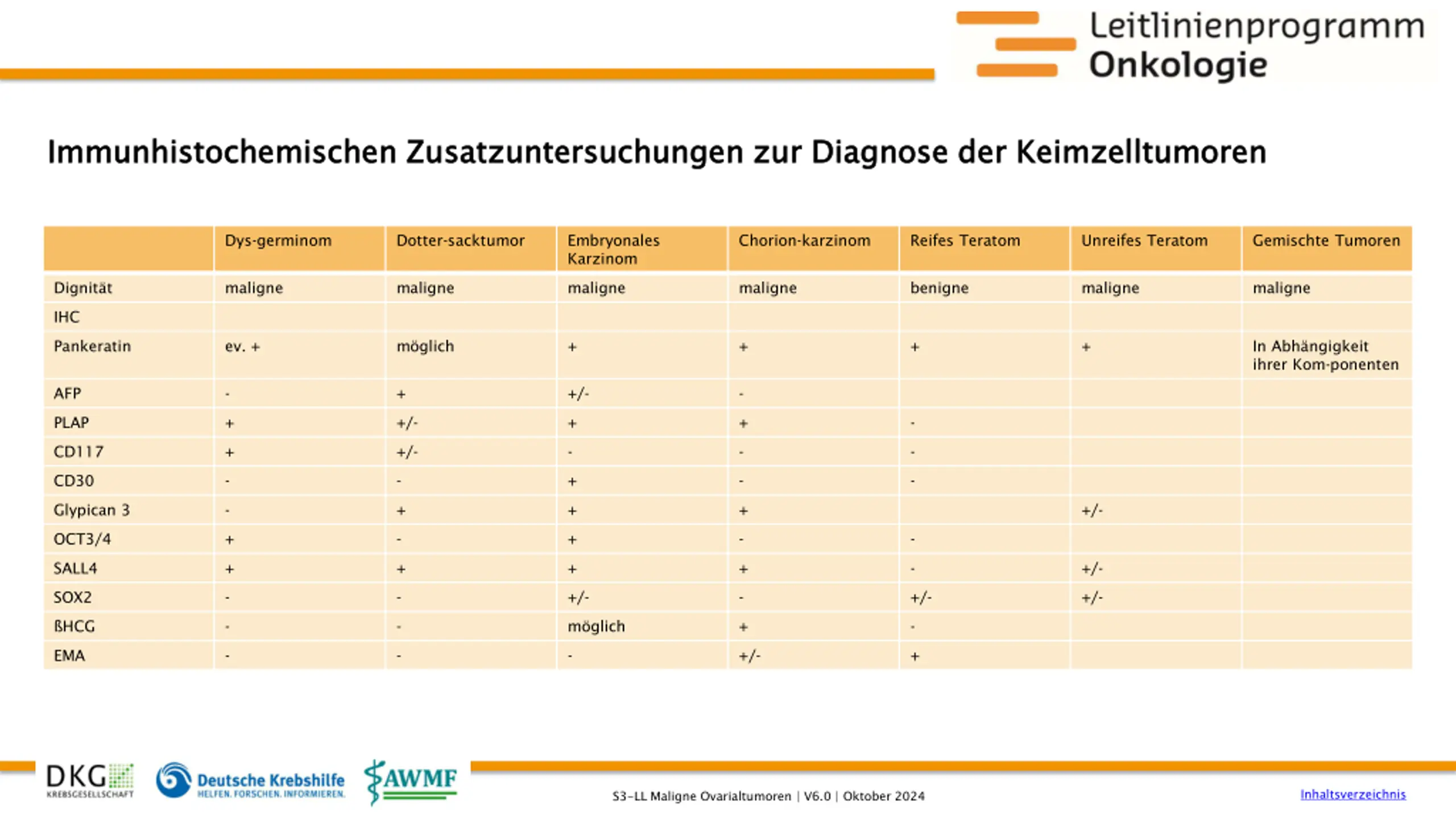 Immunhistochemischen Zusatzuntersuchungen zur Diagnose der Keimzelltumoren Immunhistochemischen Zusatzuntersuchungen zur Diagnose der Keimzelltumoren Dys-germinom Dotter-sacktumor Embryonales Karzinom Chorion-karzinom Reifes Teratom Unreifes Teratom Gemischte Tumoren Dignit t maligne maligne maligne maligne benigne maligne maligne IHC Pankeratin ev. + m glich + + + + In Abh ngigkeit ihrer Kom-ponenten AFP - + +/- - PLAP + +/- + + - CD117 + +/- - - - CD30 - - + - - Glypican 3 - + + + +/- OCT3/4 + - + - - SALL4 + + + + - +/- SOX2 - - +/- - +/- +/- HCG - - m glich + - EMA - - - +/- + Inhaltsverzeichnis S3-LL Maligne Ovarialtumoren | V6.0 | Oktober 2024