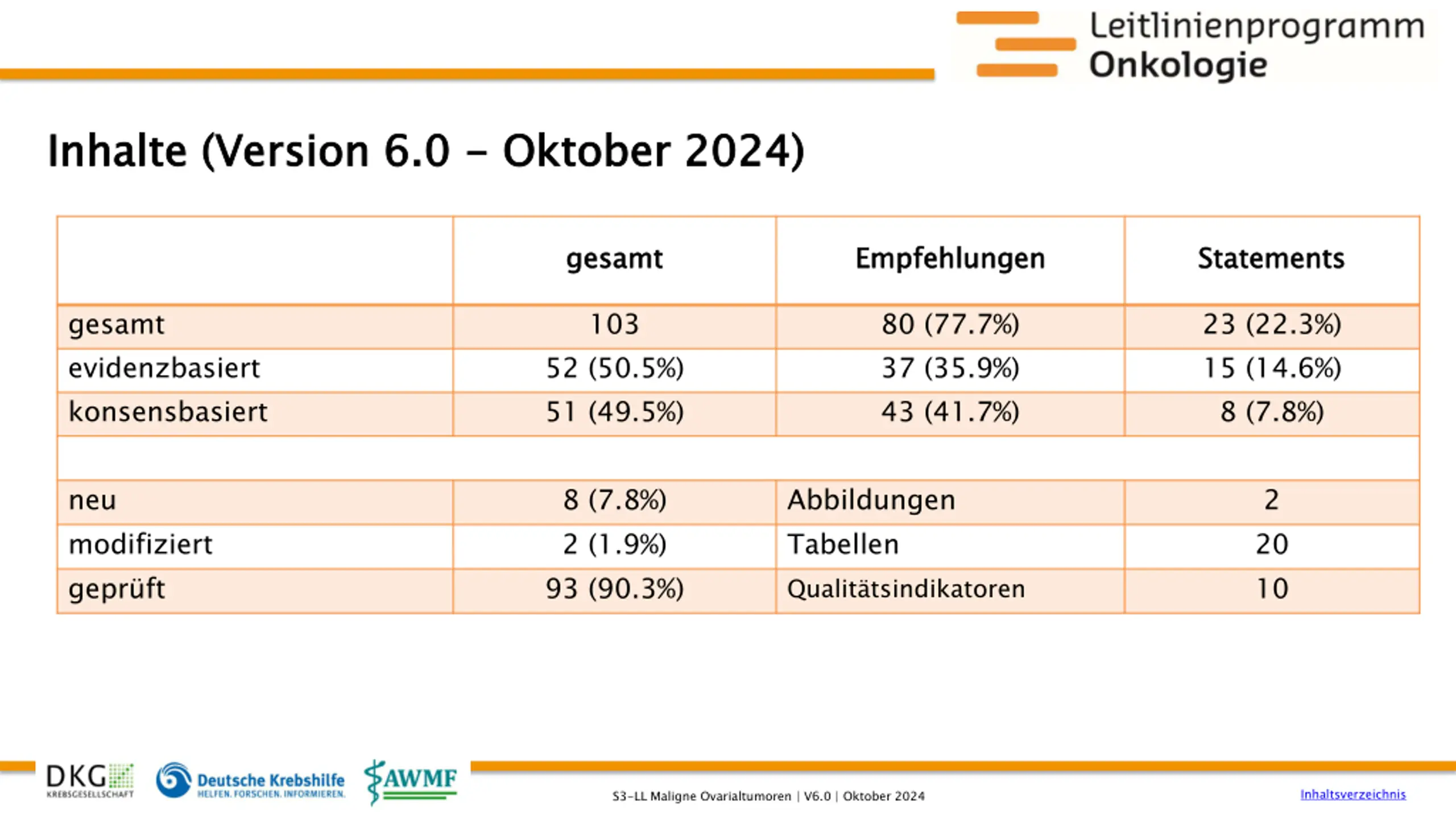 Inhalte (Version 6.0 Inhalte (Version 6.0 - - Oktober 2024) Oktober 2024) gesamt gesamt Empfehlungen Empfehlungen Statements Statements gesamt evidenzbasiert konsensbasiert 103 80 (77.7%) 37 (35.9%) 43 (41.7%) 23 (22.3%) 15 (14.6%) 8 (7.8%) 52 (50.5%) 51 (49.5%) neu modifiziert gepr ft 8 (7.8%) 2 (1.9%) 93 (90.3%) Abbildungen Tabellen Qualit tsindikatoren 2 20 10 Inhaltsverzeichnis S3-LL Maligne Ovarialtumoren | V6.0 | Oktober 2024