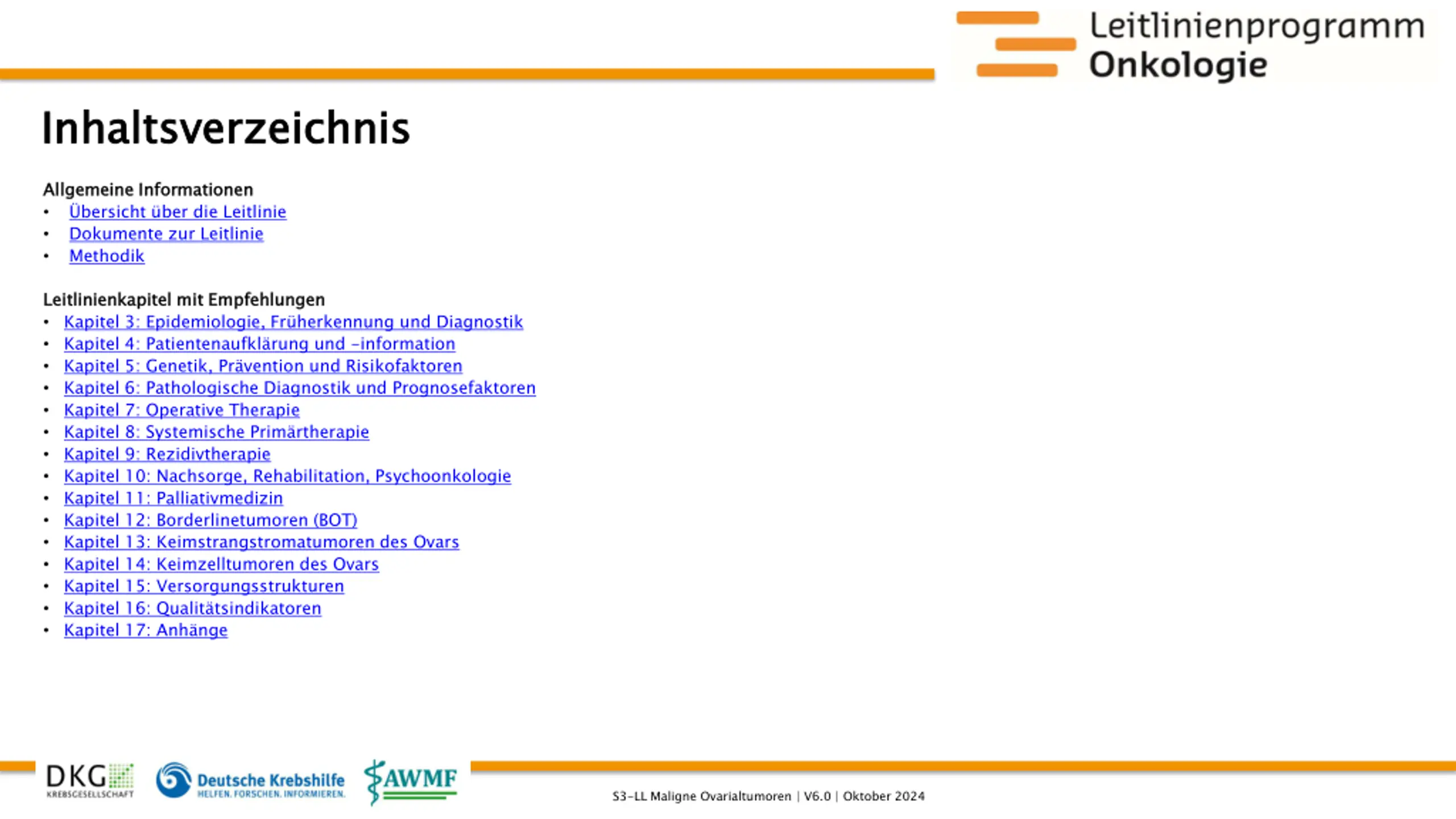 Inhaltsverzeichnis Inhaltsverzeichnis Allgemeine Informationen bersicht ber die Leitlinie Dokumente zur Leitlinie Methodik Allgemeine Informationen Leitlinienkapitel mit Empfehlungen Kapitel 3: Epidemiologie, Fr herkennung und Diagnostik Kapitel 4: Patientenaufkl rung und -information Kapitel 5: Genetik, Pr vention und Risikofaktoren Kapitel 6: Pathologische Diagnostik und Prognosefaktoren Kapitel 7: Operative Therapie Kapitel 8: Systemische Prim rtherapie Kapitel 9: Rezidivtherapie Kapitel 10: Nachsorge, Rehabilitation, Psychoonkologie Kapitel 11: Palliativmedizin Kapitel 12: Borderlinetumoren (BOT) Kapitel 13: Keimstrangstromatumoren des Ovars Kapitel 14: Keimzelltumoren des Ovars Kapitel 15: Versorgungsstrukturen Kapitel 16: Qualit tsindikatoren Kapitel 17: Anh nge Leitlinienkapitel mit Empfehlungen S3-LL Maligne Ovarialtumoren | V6.0 | Oktober 2024