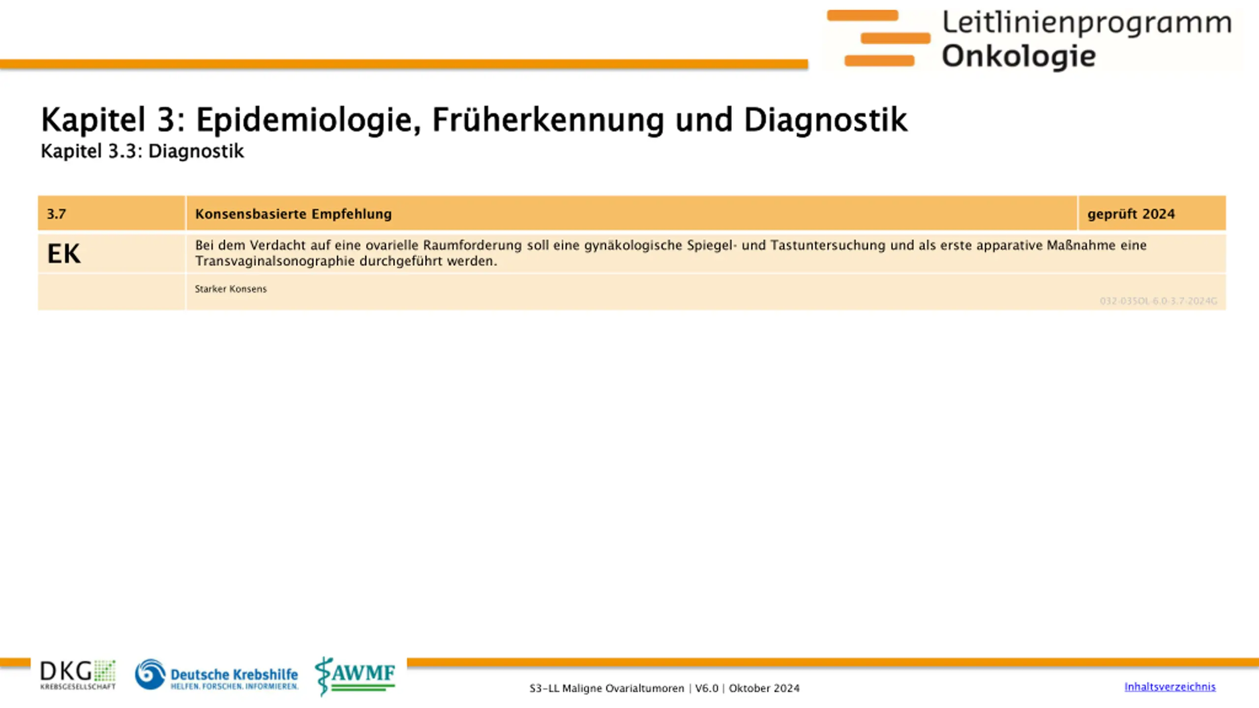 Kapitel 3: Epidemiologie, Frherkennung und Diagnostik Kapitel 3.3: Diagnostik Kapitel 3: Epidemiologie, Fr herkennung und Diagnostik Kapitel 3.3: Diagnostik 3.7 Konsensbasierte Empfehlung gepr ft 2024 Bei dem Verdacht auf eine ovarielle Raumforderung soll eine gyn kologische Spiegel- und Tastuntersuchung und als erste apparative Ma nahme eine Transvaginalsonographie durchgef hrt werden. EK Starker Konsens 032-035OL-6.0-3.7-2024G Inhaltsverzeichnis S3-LL Maligne Ovarialtumoren | V6.0 | Oktober 2024
