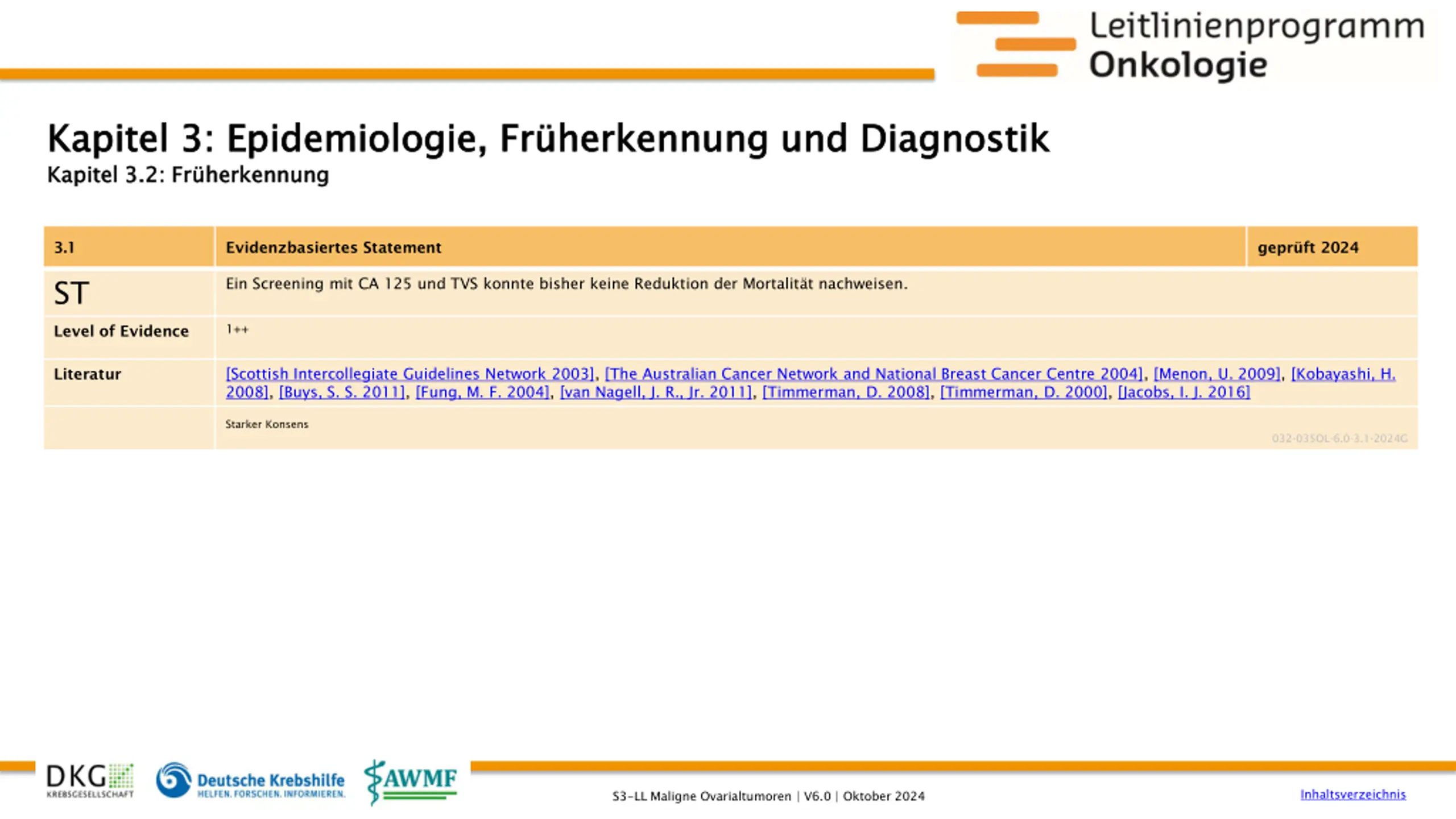 Kapitel 3: Epidemiologie, Frherkennung und Diagnostik Kapitel 3.2: Fr herkennung Kapitel 3: Epidemiologie, Fr herkennung und Diagnostik Kapitel 3.2: Fr herkennung 3.1 Evidenzbasiertes Statement gepr ft 2024 Ein Screening mit CA 125 und TVS konnte bisher keine Reduktion der Mortalit t nachweisen. ST 1++ Level of Evidence [Scottish Intercollegiate Guidelines Network 2003], [The Australian Cancer Network and National Breast Cancer Centre 2004], [Menon, U. 2009], [Kobayashi, H. 2008], [Buys, S. S. 2011], [Fung, M. F. 2004], [van Nagell, J. R., Jr. 2011], [Timmerman, D. 2008], [Timmerman, D. 2000], [Jacobs, I. J. 2016] Literatur Starker Konsens 032-035OL-6.0-3.1-2024G Inhaltsverzeichnis S3-LL Maligne Ovarialtumoren | V6.0 | Oktober 2024