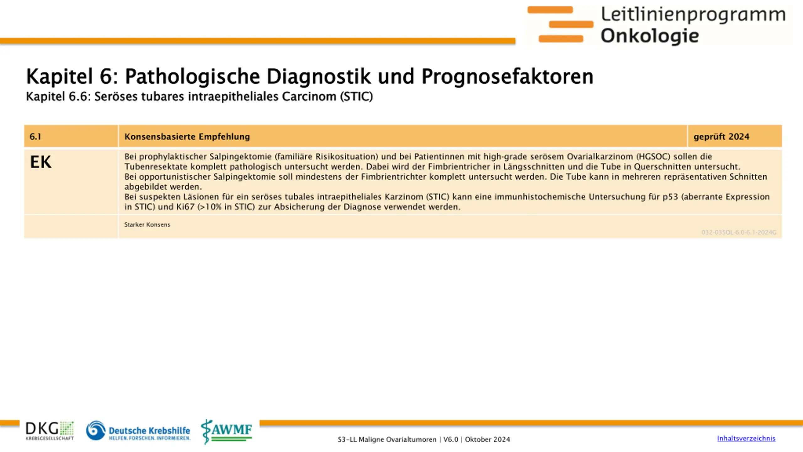 Kapitel 6: Pathologische Diagnostik und Prognosefaktoren Kapitel 6.6: Ser ses tubares intraepitheliales Carcinom (STIC) Kapitel 6: Pathologische Diagnostik und Prognosefaktoren Kapitel 6.6: Ser ses tubares intraepitheliales Carcinom (STIC) 6.1 Konsensbasierte Empfehlung gepr ft 2024 Bei prophylaktischer Salpingektomie (famili re Risikosituation) und bei Patientinnen mit high-grade ser sem Ovarialkarzinom (HGSOC) sollen die Tubenresektate komplett pathologisch untersucht werden. Dabei wird der Fimbrientricher in L ngsschnitten und die Tube in Querschnitten untersucht. Bei opportunistischer Salpingektomie soll mindestens der Fimbrientrichter komplett untersucht werden. Die Tube kann in mehreren repr sentativen Schnitten abgebildet werden. Bei suspekten L sionen f r ein ser ses tubales intraepitheliales Karzinom (STIC) kann eine immunhistochemische Untersuchung f r p53 (aberrante Expression in STIC) und Ki67 (>10% in STIC) zur Absicherung der Diagnose verwendet werden. EK Starker Konsens 032-035OL-6.0-6.1-2024G Inhaltsverzeichnis S3-LL Maligne Ovarialtumoren | V6.0 | Oktober 2024