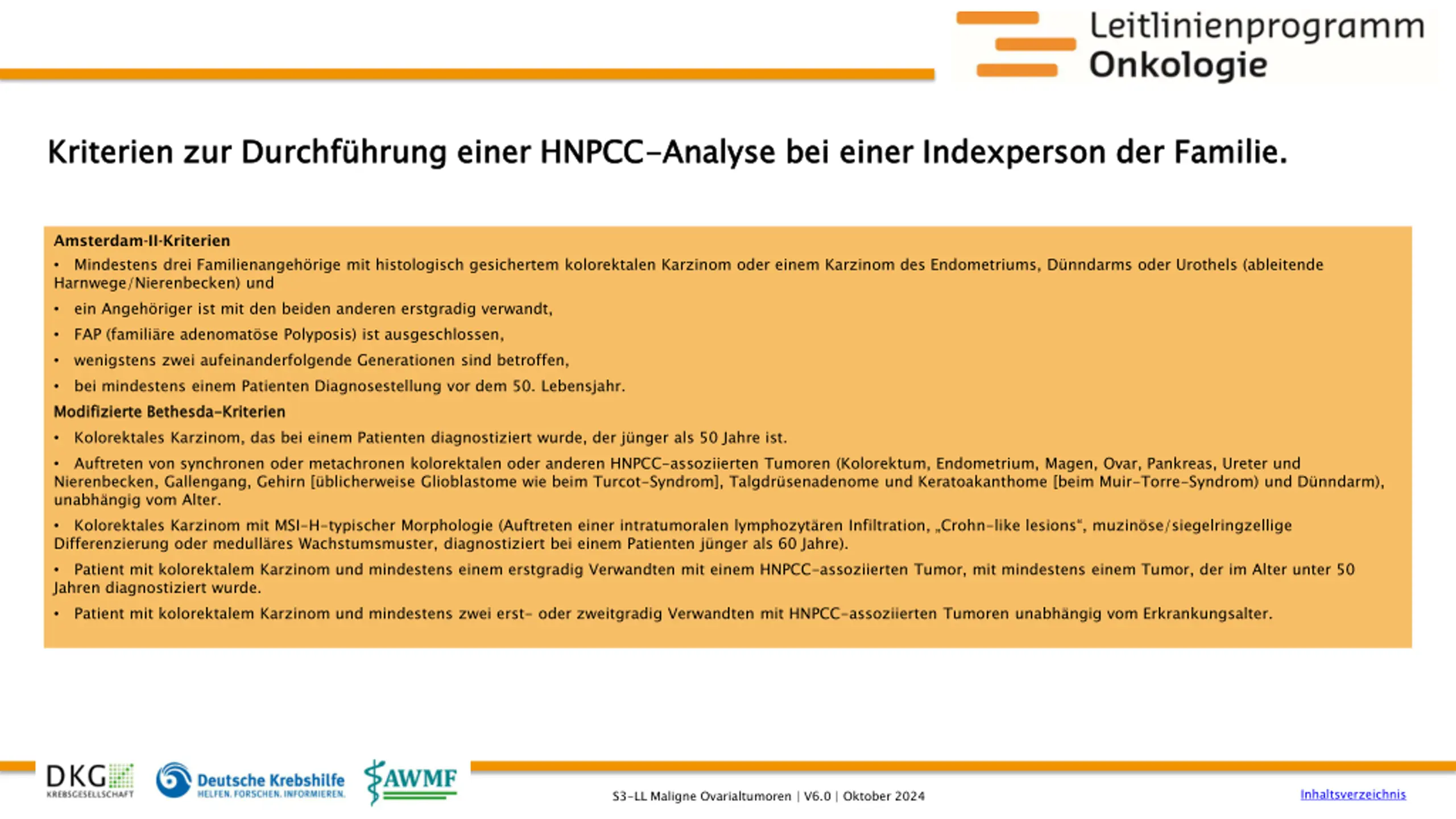 Kriterien zur Durchfhrung einer HNPCC Kriterien zur Durchf hrung einer HNPCC- -Analyse bei einer Indexperson der Familie. Analyse bei einer Indexperson der Familie. Amsterdam-II-Kriterien Mindestens drei Familienangeh rige mit histologisch gesichertem kolorektalen Karzinom oder einem Karzinom des Endometriums, D nndarms oder Urothels (ableitende Harnwege/Nierenbecken) und ein Angeh riger ist mit den beiden anderen erstgradig verwandt, FAP (famili re adenomat se Polyposis) ist ausgeschlossen, wenigstens zwei aufeinanderfolgende Generationen sind betroffen, bei mindestens einem Patienten Diagnosestellung vor dem 50. Lebensjahr. Modifizierte Kolorektales Karzinom, das bei einem Patienten diagnostiziert wurde, der j nger als 50 Jahre ist. Auftreten von synchronen oder metachronen kolorektalen oder anderen HNPCC-assoziierten Tumoren (Kolorektum, Endometrium, Magen, Ovar, Pankreas, Ureter und Nierenbecken, Gallengang, Gehirn [ blicherweise Glioblastome wie beim Turcot-Syndrom], Talgdr senadenome und Keratoakanthome [beim Muir-Torre-Syndrom) und D nndarm), unabh ngig vom Alter. Kolorektales Karzinom mit MSI-H-typischer Morphologie (Auftreten einer intratumoralen lymphozyt ren Infiltration, Crohn-like lesions , muzin se/siegelringzellige Differenzierung oder medull res Wachstumsmuster, diagnostiziert bei einem Patienten j nger als 60 Jahre). Patient mit kolorektalem Karzinom und mindestens einem erstgradig Verwandten mit einem HNPCC-assoziierten Tumor, mit mindestens einem Tumor, der im Alter unter 50 Jahren diagnostiziert wurde. Patient mit kolorektalem Karzinom und mindestens zwei erst- oder zweitgradig Verwandten mit HNPCC-assoziierten Tumoren unabh ngig vom Erkrankungsalter.] ] Modifizierte Bethesda Bethesda- -Kriterien Kriterien Inhaltsverzeichnis S3-LL Maligne Ovarialtumoren | V6.0 | Oktober 2024