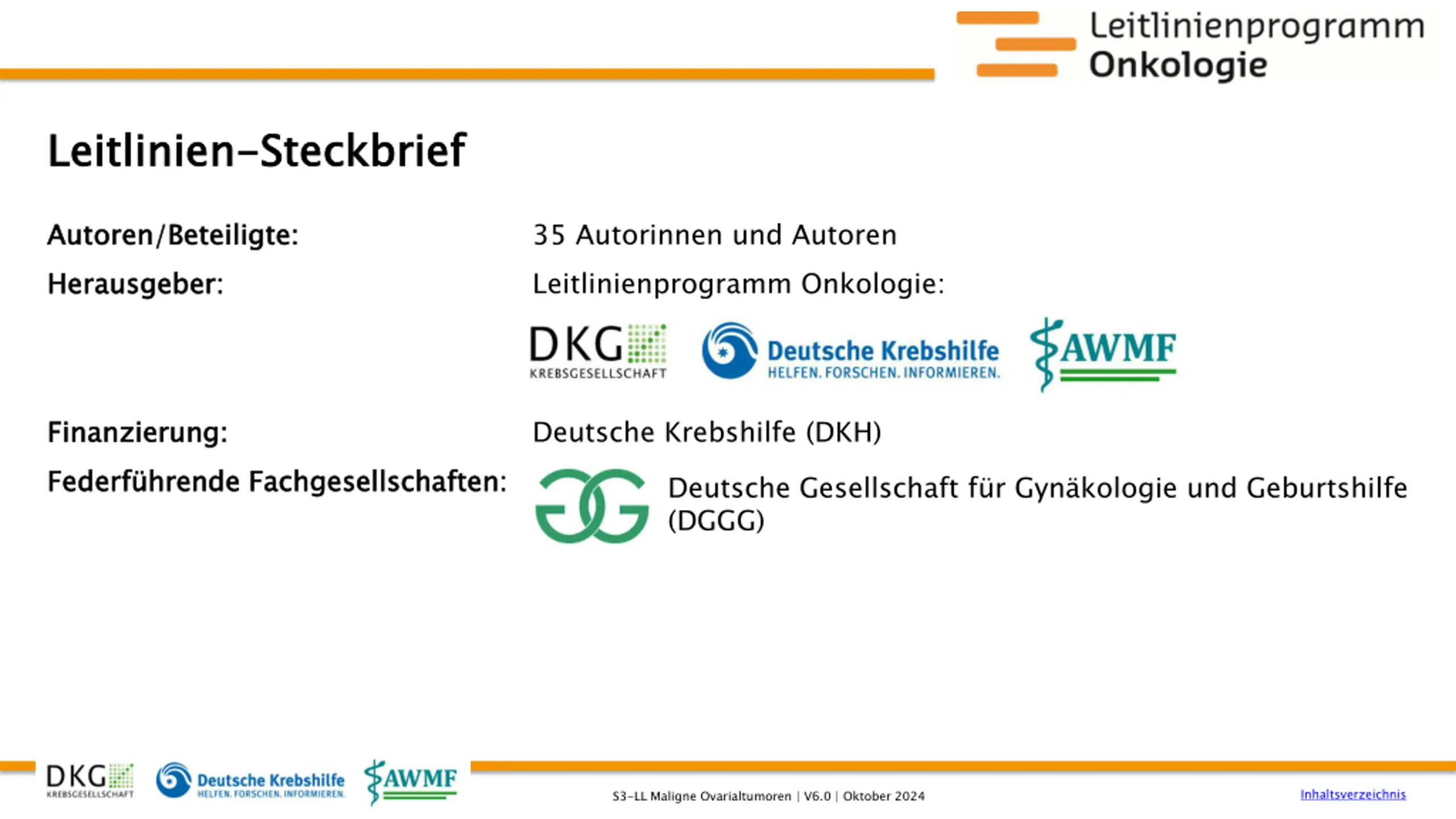 Leitlinien Leitlinien- -Steckbrief Steckbrief Autoren/Beteiligte: Herausgeber: Autoren/Beteiligte: Herausgeber: 35 Autorinnen und Autoren Leitlinienprogramm Onkologie: Finanzierung: Federf hrende Fachgesellschaften: Finanzierung: Federf hrende Fachgesellschaften: Deutsche Krebshilfe (DKH) Deutsche Gesellschaft f r Gyn kologie und Geburtshilfe (DGGG) Inhaltsverzeichnis S3-LL Maligne Ovarialtumoren | V6.0 | Oktober 2024