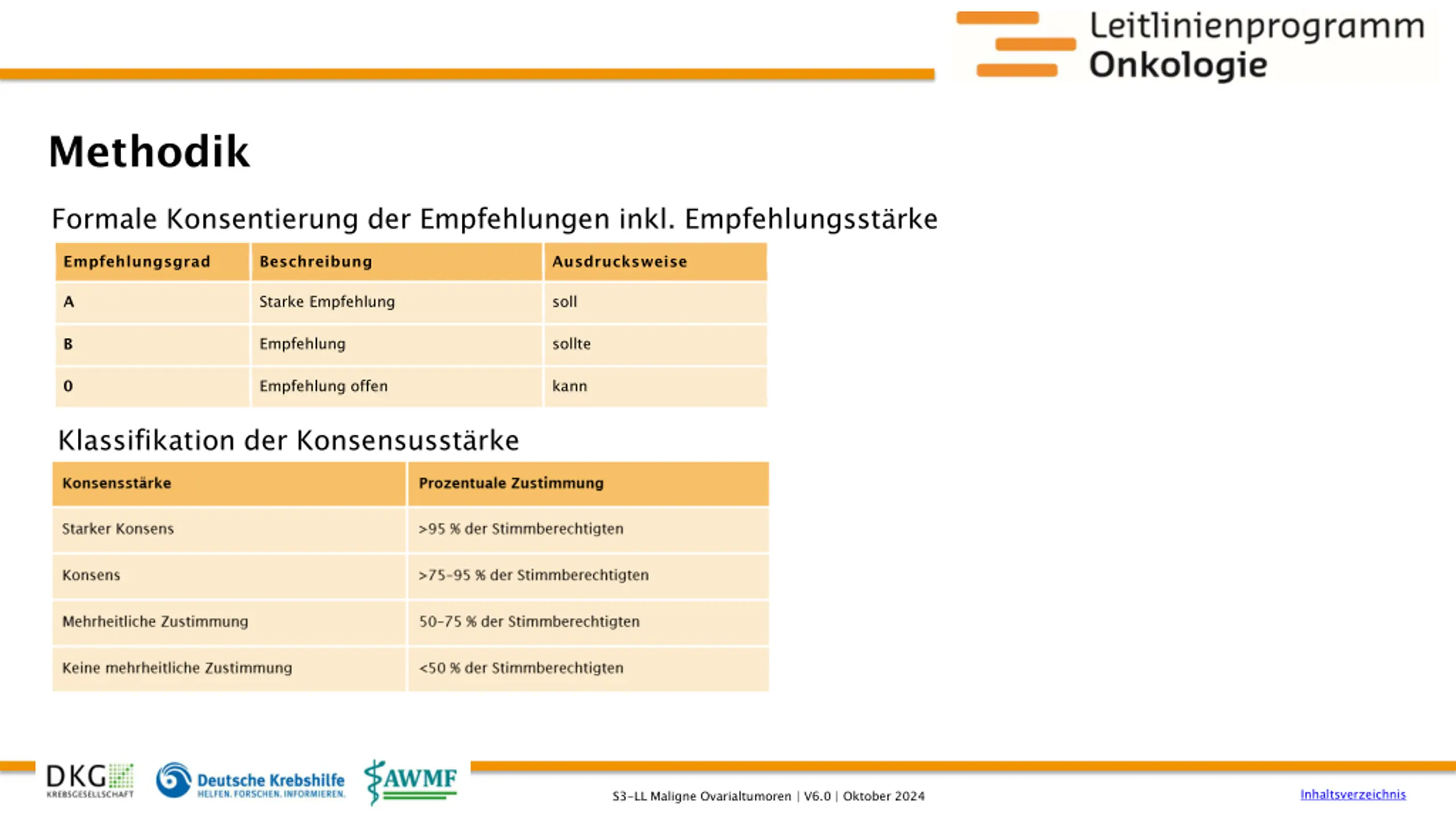 Methodik Formale Konsentierung der Empfehlungen inkl. Empfehlungsst rke Empfehlungsgrad Beschreibung Ausdrucksweise Starke Empfehlung soll A Empfehlung sollte B Empfehlung offen kann 0 Klassifikation der Konsensusst rke Inhaltsverzeichnis S3-LL Maligne Ovarialtumoren | V6.0 | Oktober 2024