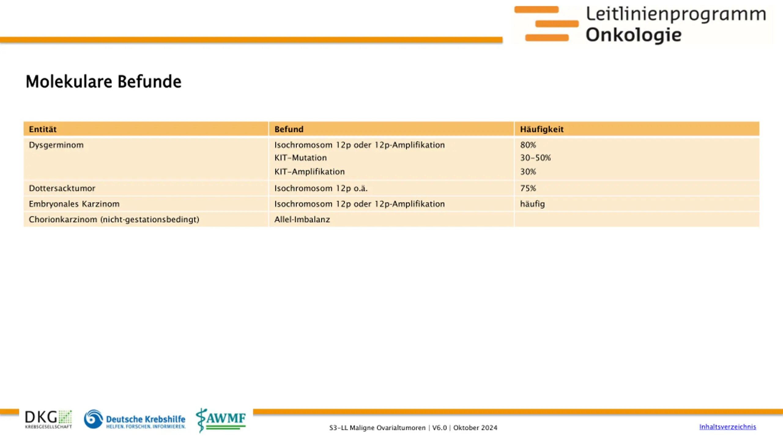 Molekulare Befunde Molekulare Befunde Entit t Befund H ufigkeit Dysgerminom Isochromosom 12p oder 12p-Amplifikation KIT-Mutation KIT-Amplifikation 80% 30-50% 30% Dottersacktumor Isochromosom 12p o. . 75% Embryonales Karzinom Isochromosom 12p oder 12p-Amplifikation h ufig Chorionkarzinom (nicht-gestationsbedingt) Allel-Imbalanz Inhaltsverzeichnis S3-LL Maligne Ovarialtumoren | V6.0 | Oktober 2024