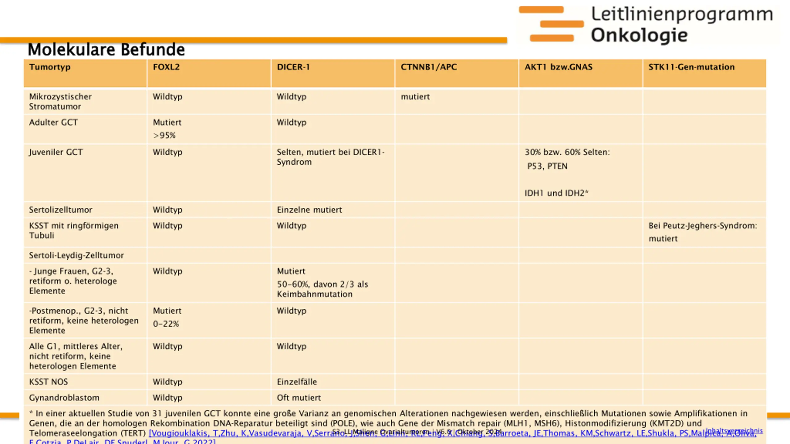 Molekulare Tumortyp Molekulare Befunde Befunde FOXL2 DICER-1 CTNNB1/APC AKT1 bzw.GNAS STK11-Gen-mutation Mikrozystischer Stromatumor Wildtyp Wildtyp mutiert Adulter GCT Mutiert >95% Wildtyp Juveniler GCT Wildtyp Selten, mutiert bei DICER1- Syndrom 30% bzw. 60% Selten: P53, PTEN IDH1 und IDH2* Sertolizelltumor Wildtyp Einzelne mutiert KSST mit ringf rmigen Tubuli Wildtyp Wildtyp Bei Peutz-Jeghers-Syndrom: mutiert Sertoli-Leydig-Zelltumor - Junge Frauen, G2-3, retiform o. heterologe Elemente Wildtyp Mutiert 50-60%, davon 2/3 als Keimbahnmutation -Postmenop., G2-3, nicht retiform, keine heterologen Elemente Mutiert 0-22% Wildtyp Alle G1, mittleres Alter, nicht retiform, keine heterologen Elemente Wildtyp Wildtyp KSST NOS Wildtyp Einzelf lle Gynandroblastom Wildtyp Oft mutiert * In einer aktuellen Studie von 31 juvenilen GCT konnte eine gro e Varianz an genomischen Alterationen nachgewiesen werden, einschlie lich Mutationen sowie Amplifikationen in Genen, die an der homologen Rekombination DNA-Reparatur beteiligt sind (POLE), wie auch Gene der Mismatch repair (MLH1, MSH6), Histonmodifizierung (KMT2D) und Telomeraseelongation (TERT) [Vougiouklakis, T,Zhu, K,Vasudevaraja, V,Serrano, J,Shen, G,Linn, RL,Feng, X,Chiang, S,Barroeta, JE,Thomas, KM,Schwartz, LE,Shukla, PS,Malpica, A,Oliva, E,Cotzia P,DeLair DF,Snuderl M,Jour, G 2022] Inhaltsverzeichnis S3-LL Maligne Ovarialtumoren | V6.0 | Oktober 2024