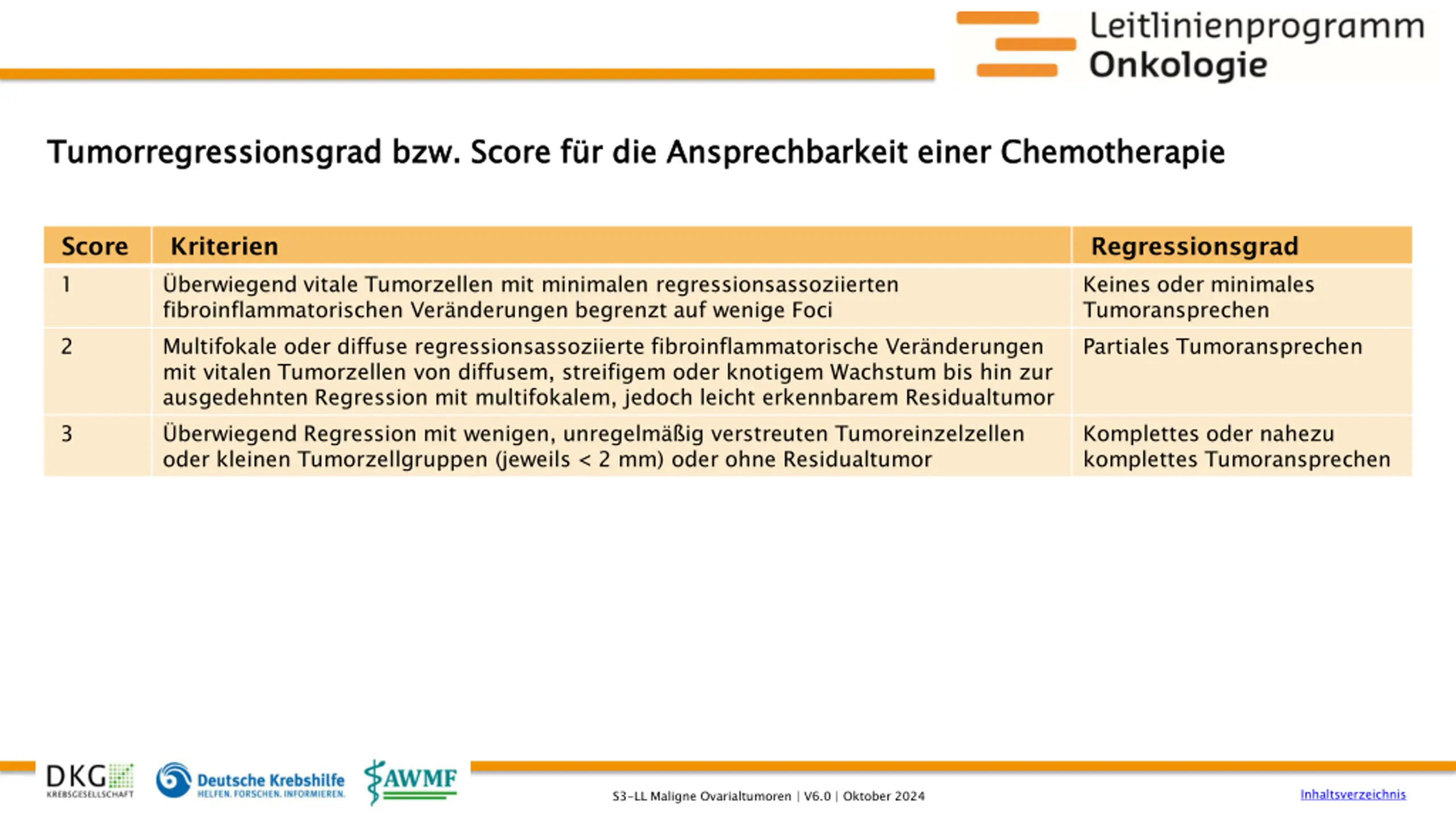 Tumorregressionsgrad bzw. Score fr die Ansprechbarkeit einer Chemotherapie Tumorregressionsgrad bzw. Score f r die Ansprechbarkeit einer Chemotherapie Score Kriterien Regressionsgrad 1 berwiegend vitale Tumorzellen mit minimalen regressionsassoziierten fibroinflammatorischen Ver nderungen begrenzt auf wenige Foci Keines oder minimales Tumoransprechen 2 Multifokale oder diffuse regressionsassoziierte fibroinflammatorische Ver nderungen mit vitalen Tumorzellen von diffusem, streifigem oder knotigem Wachstum bis hin zur ausgedehnten Regression mit multifokalem, jedoch leicht erkennbarem Residualtumor Partiales Tumoransprechen 3 berwiegend Regression mit wenigen, unregelm ig verstreuten Tumoreinzelzellen oder kleinen Tumorzellgruppen (jeweils < 2 mm) oder ohne Residualtumor Komplettes oder nahezu komplettes Tumoransprechen Inhaltsverzeichnis S3-LL Maligne Ovarialtumoren | V6.0 | Oktober 2024