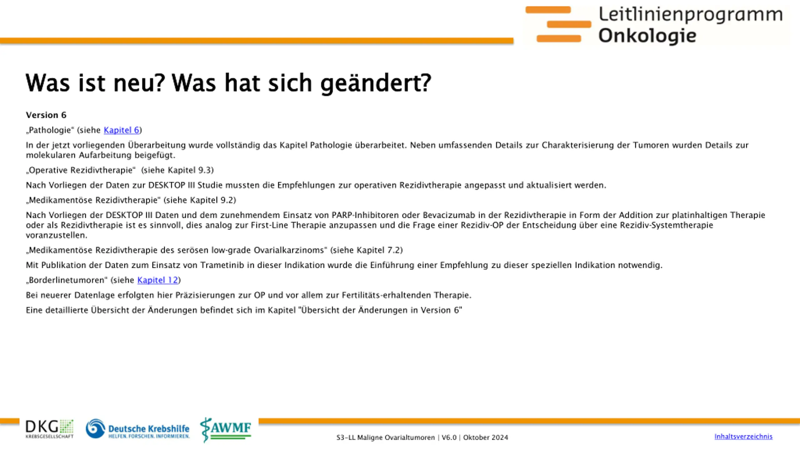 Was ist neu? Was hat sich gendert? Was ist neu? Was hat sich ge ndert? Version 6 Pathologie (siehe Kapitel 6) In der jetzt vorliegenden berarbeitung wurde vollst ndig das Kapitel Pathologie berarbeitet. Neben umfassenden Details zur Charakterisierung der Tumoren wurden Details zur molekularen Aufarbeitung beigef gt. Operative Rezidivtherapie (siehe Kapitel 9.3) Nach Vorliegen der Daten zur DESKTOP III Studie mussten die Empfehlungen zur operativen Rezidivtherapie angepasst und aktualisiert werden. Medikament se Rezidivtherapie (siehe Kapitel 9.2) Nach Vorliegen der DESKTOP III Daten und dem zunehmendem Einsatz von PARP-Inhibitoren oder Bevacizumab in der Rezidivtherapie in Form der Addition zur platinhaltigen Therapie oder als Rezidivtherapie ist es sinnvoll, dies analog zur First-Line Therapie anzupassen und die Frage einer Rezidiv-OP der Entscheidung ber eine Rezidiv-Systemtherapie voranzustellen. Medikament se Rezidivtherapie des ser sen low-grade Ovarialkarzinoms (siehe Kapitel 7.2) Mit Publikation der Daten zum Einsatz von Trametinib in dieser Indikation wurde die Einf hrung einer Empfehlung zu dieser speziellen Indikation notwendig. Borderlinetumoren (siehe Kapitel 12) Bei neuerer Datenlage erfolgten hier Pr zisierungen zur OP und vor allem zur Fertilit ts-erhaltenden Therapie. Eine detaillierte bersicht der nderungen befindet sich im Kapitel " bersicht der nderungen in Version 6" Inhaltsverzeichnis S3-LL Maligne Ovarialtumoren | V6.0 | Oktober 2024