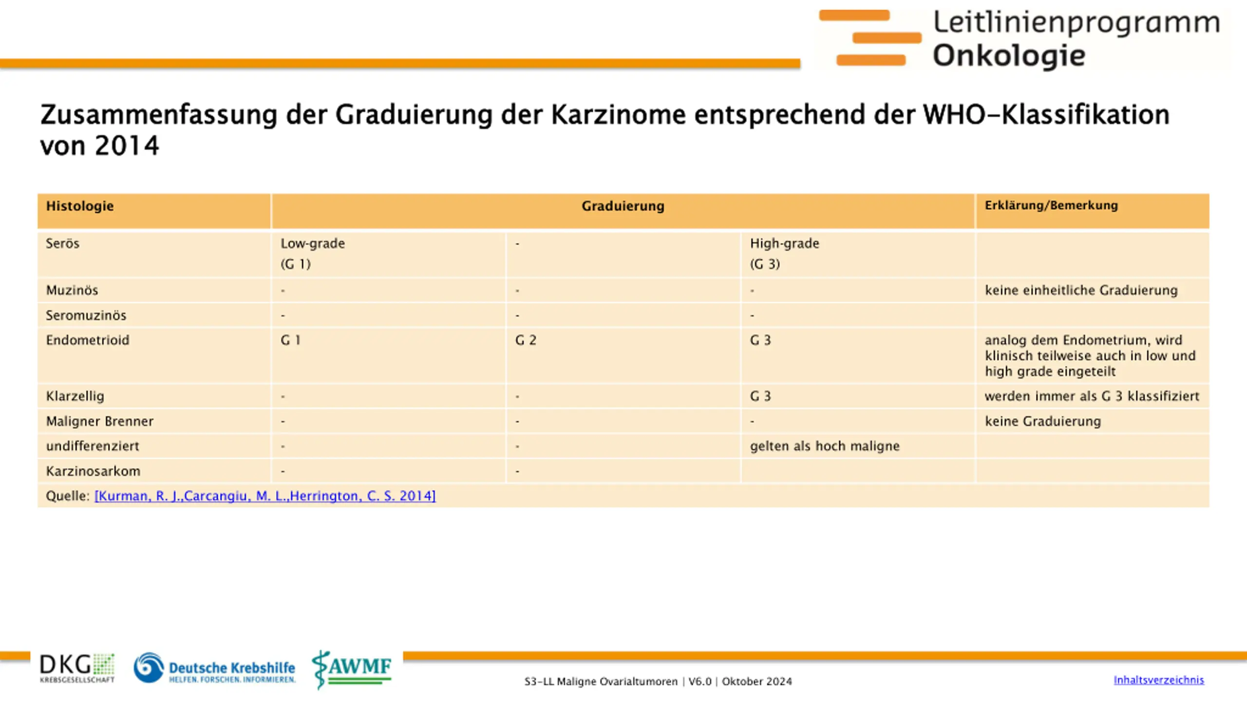 Zusammenfassung der Graduierung der Karzinome entsprechend der WHO von 2014 Zusammenfassung der Graduierung der Karzinome entsprechend der WHO- -Klassifikation von 2014 Klassifikation Erkl rung/Bemerkung Histologie Graduierung Ser s Low-grade (G 1) - High-grade (G 3) Muzin s - - - keine einheitliche Graduierung Seromuzin s - - - Endometrioid G 1 G 2 G 3 analog dem Endometrium, wird klinisch teilweise auch in low und high grade eingeteilt Klarzellig - - G 3 werden immer als G 3 klassifiziert Maligner Brenner - - - keine Graduierung undifferenziert - - gelten als hoch maligne Karzinosarkom - - Quelle: [Kurman, R. J.,Carcangiu, M. L.,Herrington, C. S. 2014] Inhaltsverzeichnis S3-LL Maligne Ovarialtumoren | V6.0 | Oktober 2024
