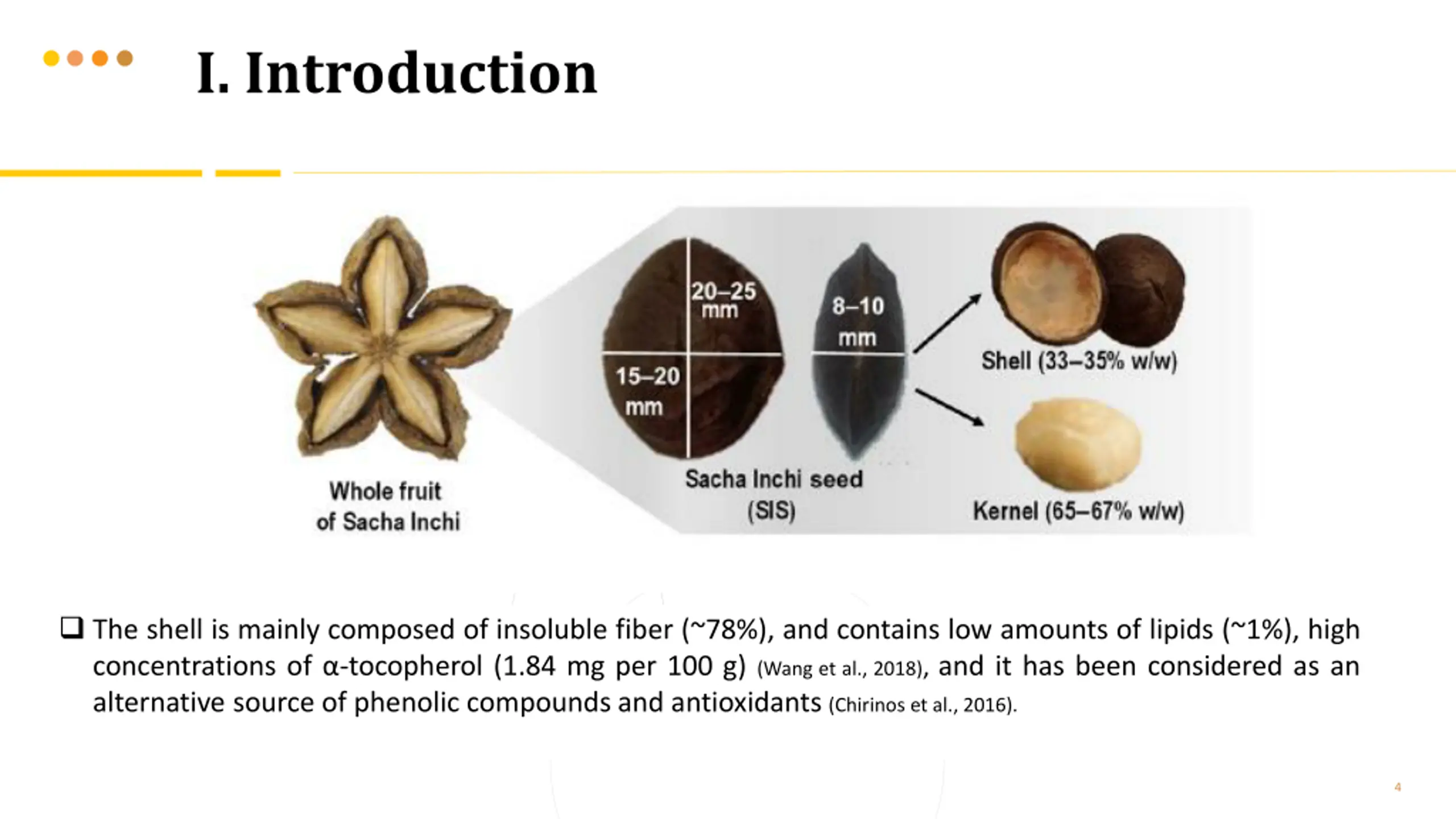 I. Introduction The shell is mainly composed of insoluble fiber (~78%), and contains low amounts of lipids (~1%), high concentrations of -tocopherol (1.84 mg per 100 g) (Wang et al., 2018), and it has been considered as an alternative source of phenolic compounds and antioxidants(Chirinos et al., 2016). 4