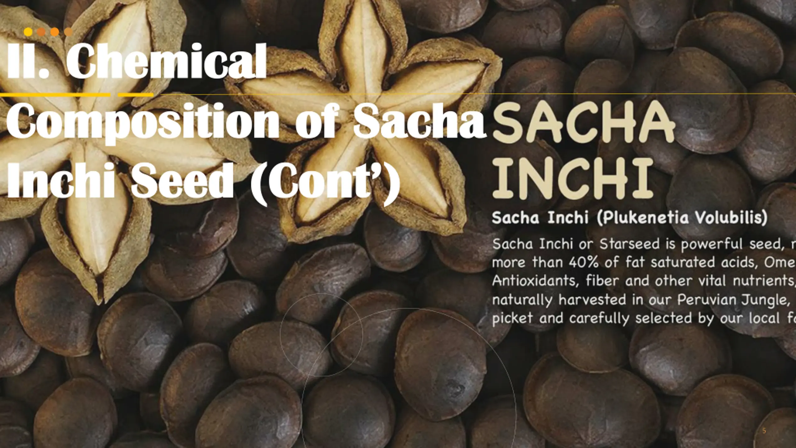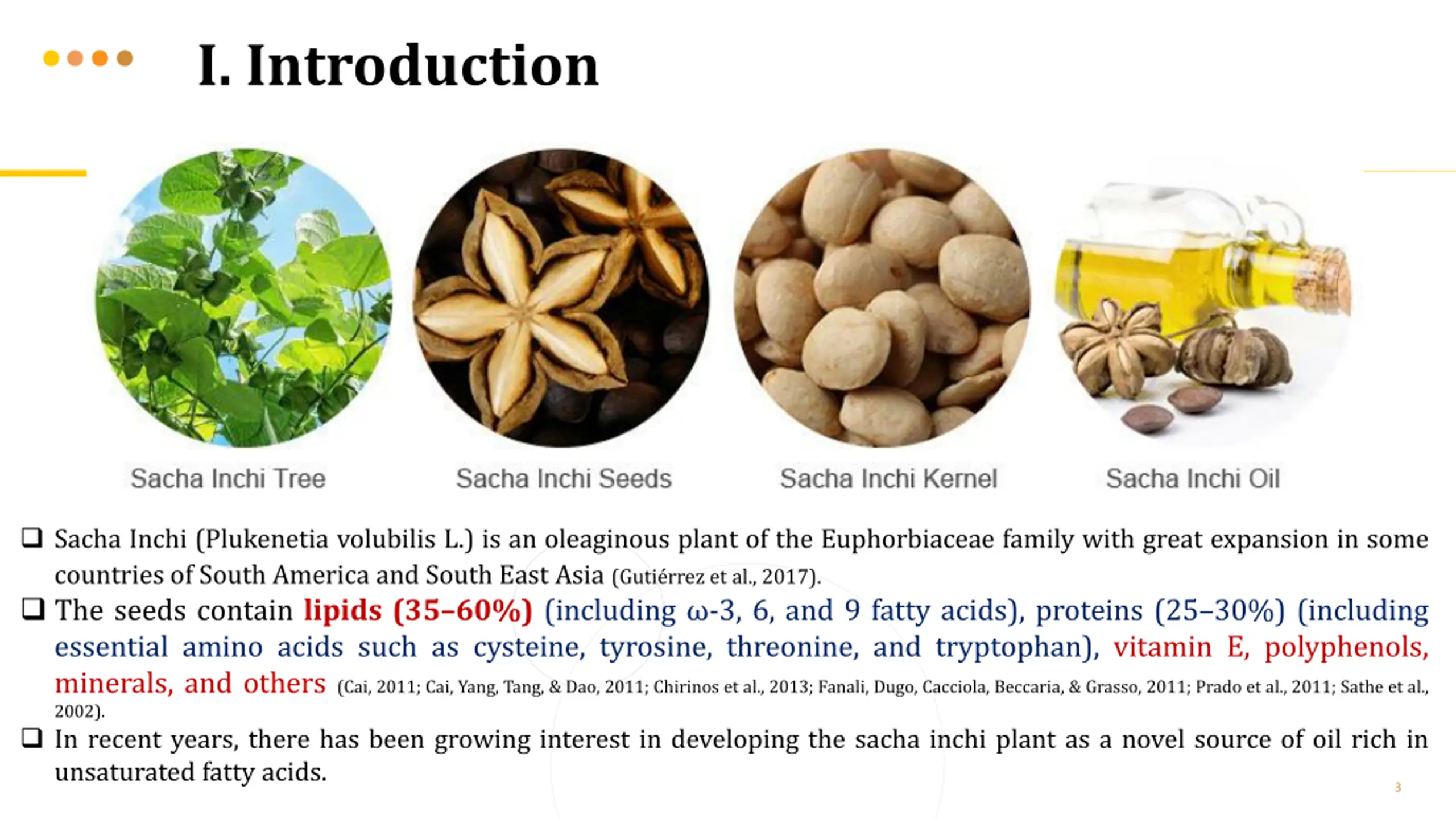 CONTENTS I. Introduction II.The nutrition of Sacha Inchi Seed III.Chemical Composition and Nutrition of sacha Inchi Oil IV.Health benefits and Application of Sacha Inchi Oil V.References 2