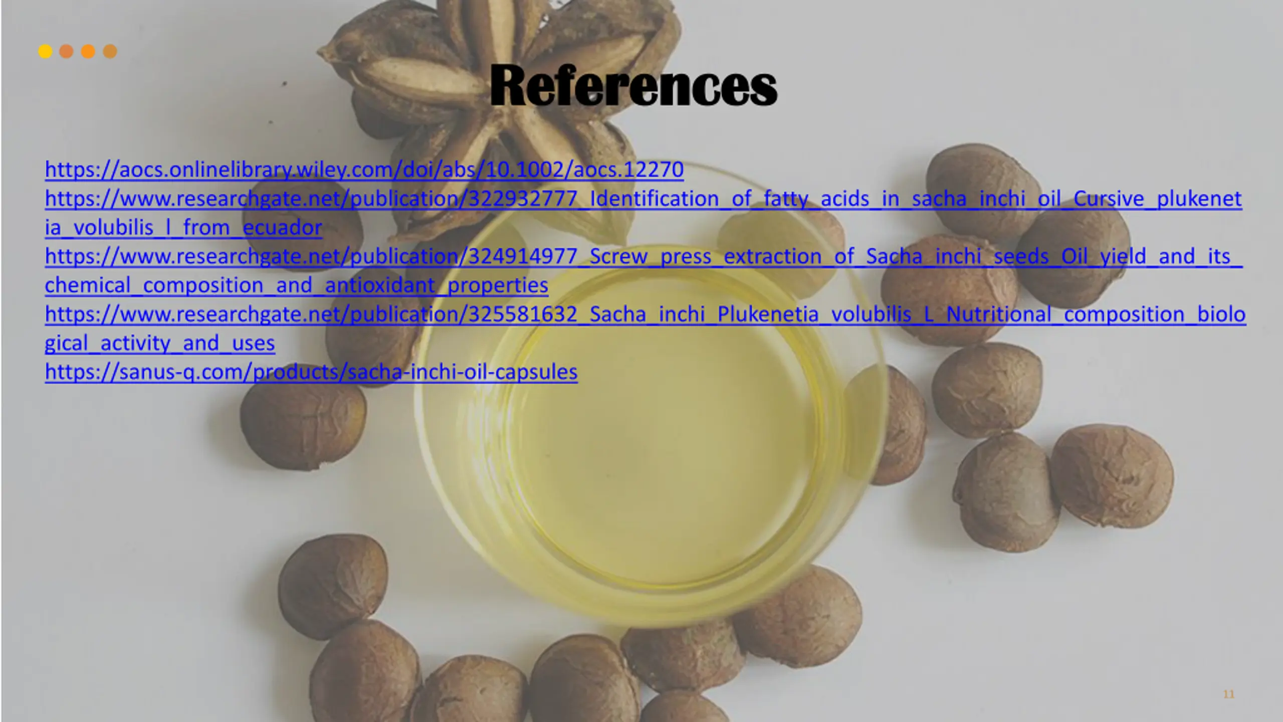 References References https://aocs.onlinelibrary.wiley.com/doi/abs/10.1002/aocs.12270 https://www.researchgate.net/publication/322932777_Identification_of_fatty_acids_in_sacha_inchi_oil_Cursive_plukenet ia_volubilis_l_from_ecuador https://www.researchgate.net/publication/324914977_Screw_press_extraction_of_Sacha_inchi_seeds_Oil_yield_and_its_ chemical_composition_and_antioxidant_properties https://www.researchgate.net/publication/325581632_Sacha_inchi_Plukenetia_volubilis_L_Nutritional_composition_biolo gical_activity_and_uses https://sanus-q.com/products/sacha-inchi-oil-capsules 11