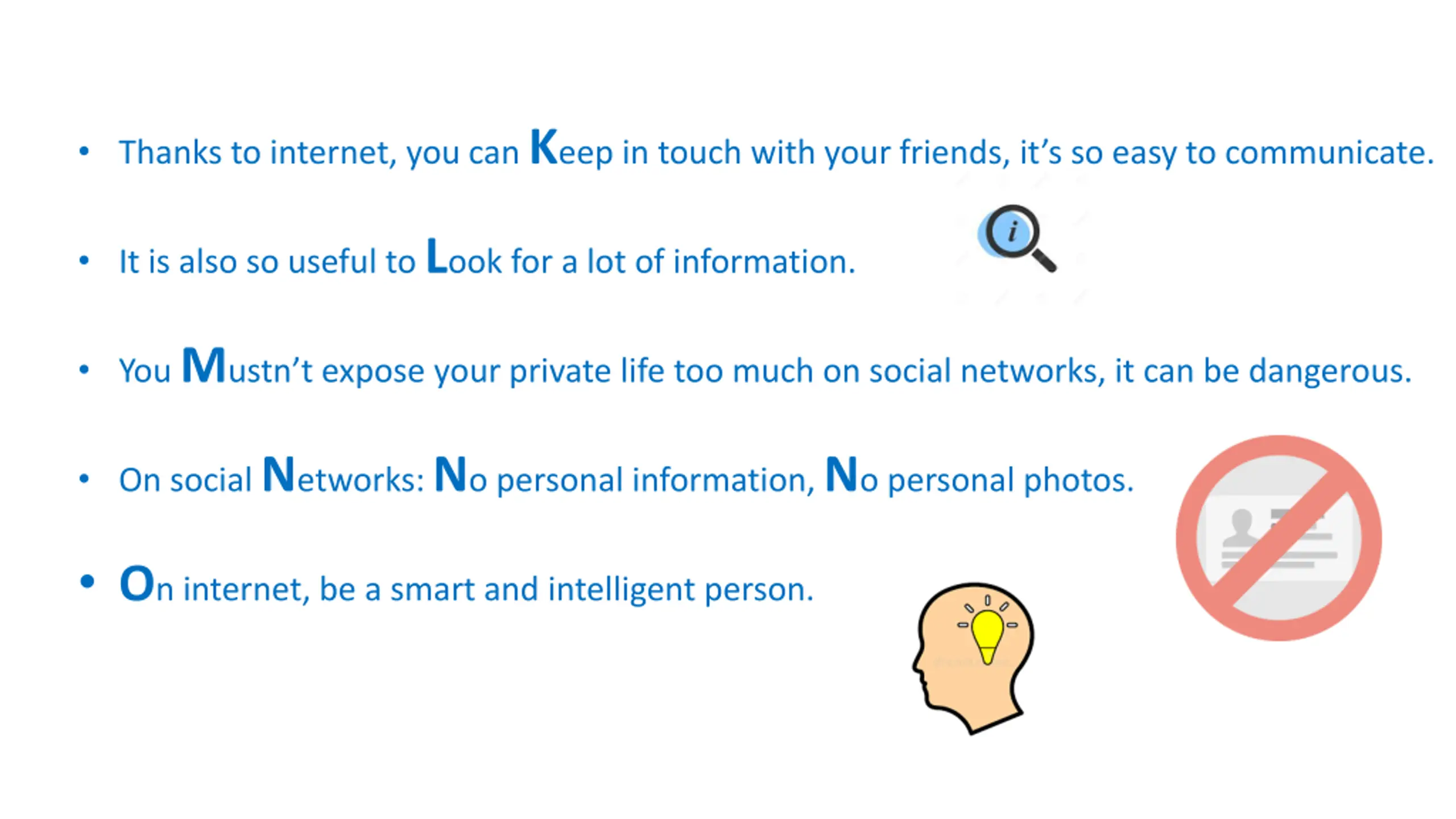 Thanks to internet, you can Keep in touch with your friends, its so easy to communicate. It is also so useful to Look for a lot of information. You Mustn t expose your private life too much on social networks, it can be dangerous. On social Networks: No personal information, No personal photos. On internet, be a smart and intelligent person.