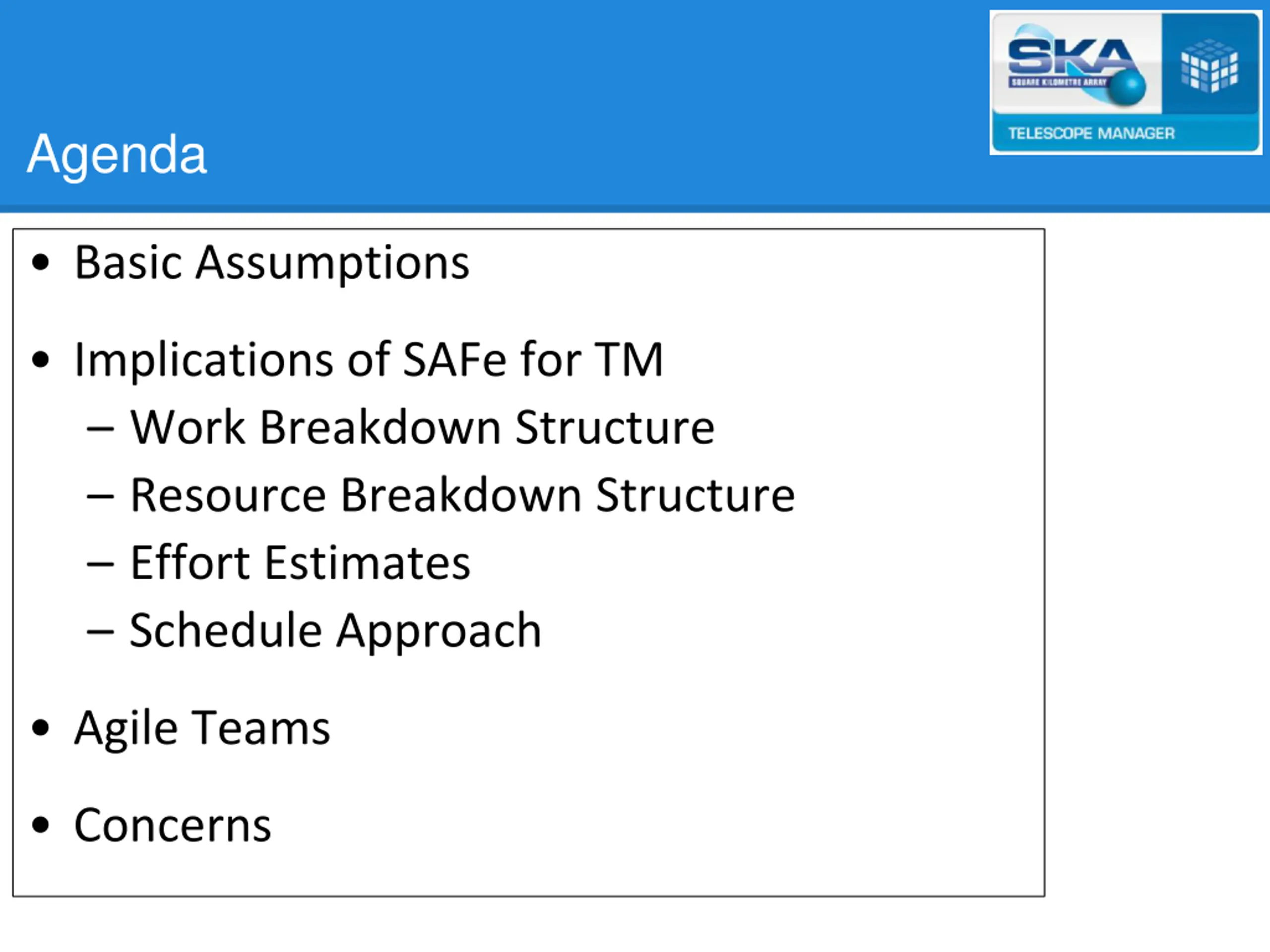 Agenda Basic Assumptions Implications of SAFe for TM Work Breakdown Structure Resource Breakdown Structure Effort Estimates Schedule Approach Agile Teams Concerns