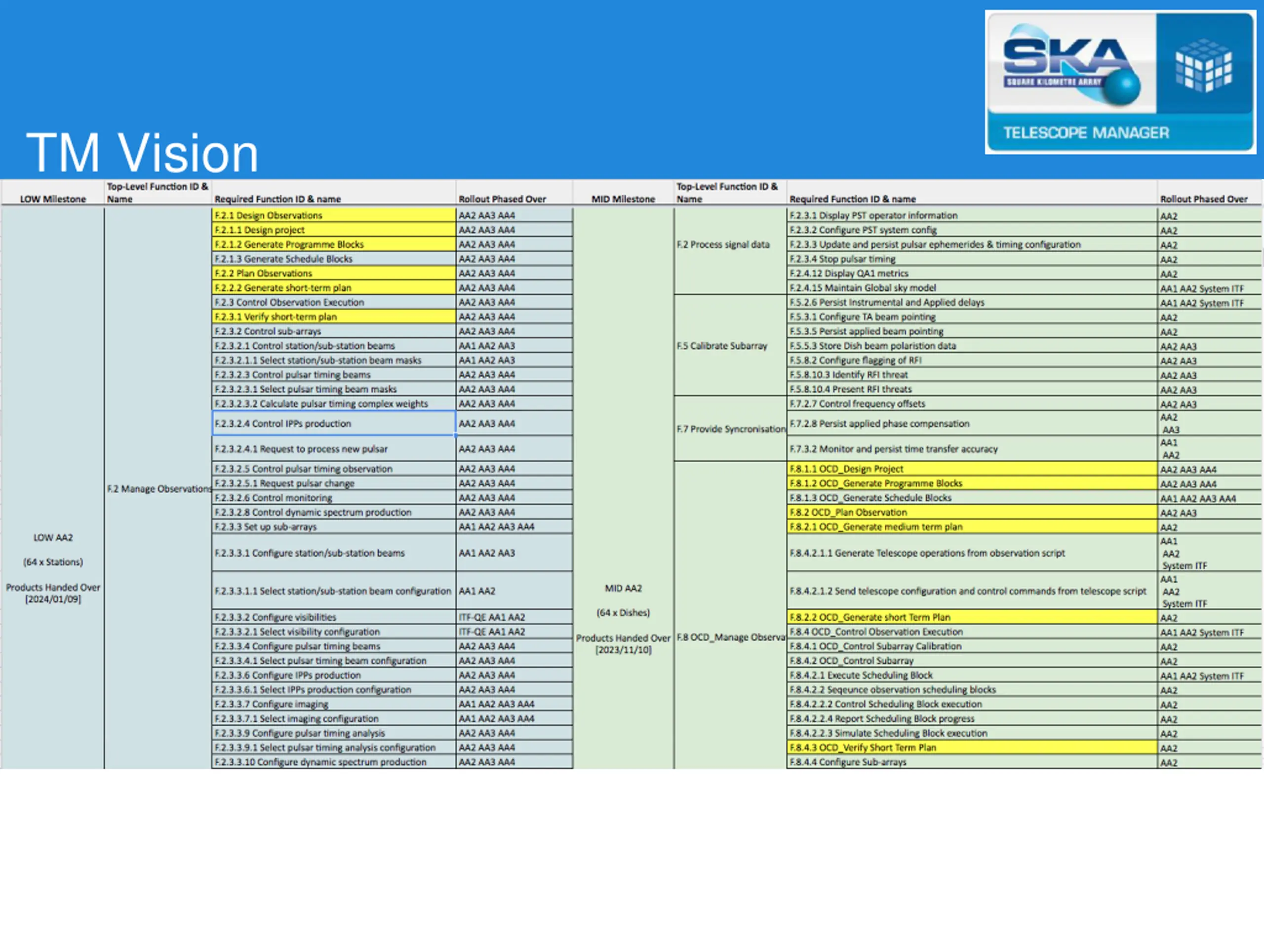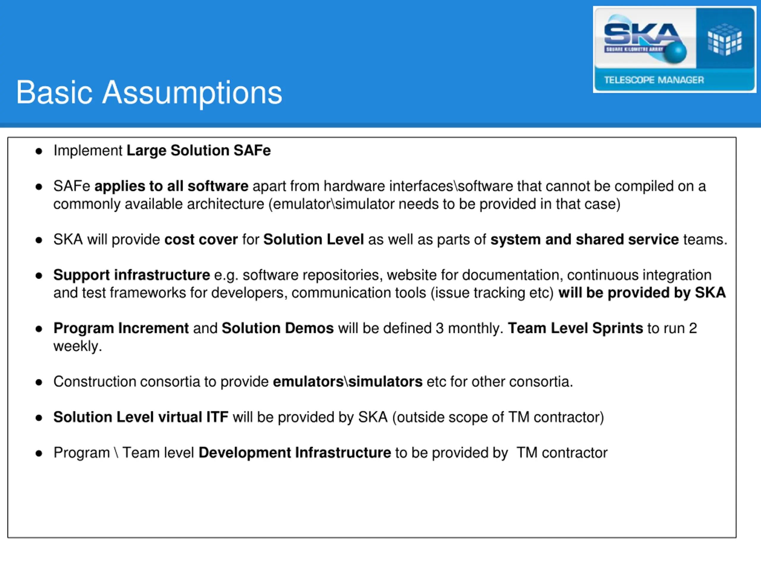 Basic Assumptions Implement Large Solution SAFe SAFe applies to all software apart from hardware interfaces\software that cannot be compiled on a commonly available architecture (emulator\simulator needs to be provided in that case) SKA will provide cost cover for Solution Level as well as parts of system and shared service teams. Support infrastructure e.g. software repositories, website for documentation, continuous integration and test frameworks for developers, communication tools (issue tracking etc) will be provided by SKA Program Increment and Solution Demos will be defined 3 monthly. Team Level Sprints to run 2 weekly. Construction consortia to provide emulators\simulators etc for other consortia. Solution Level virtual ITF will be provided by SKA (outside scope of TM contractor) Program \ Team level Development Infrastructure to be provided by TM contractor