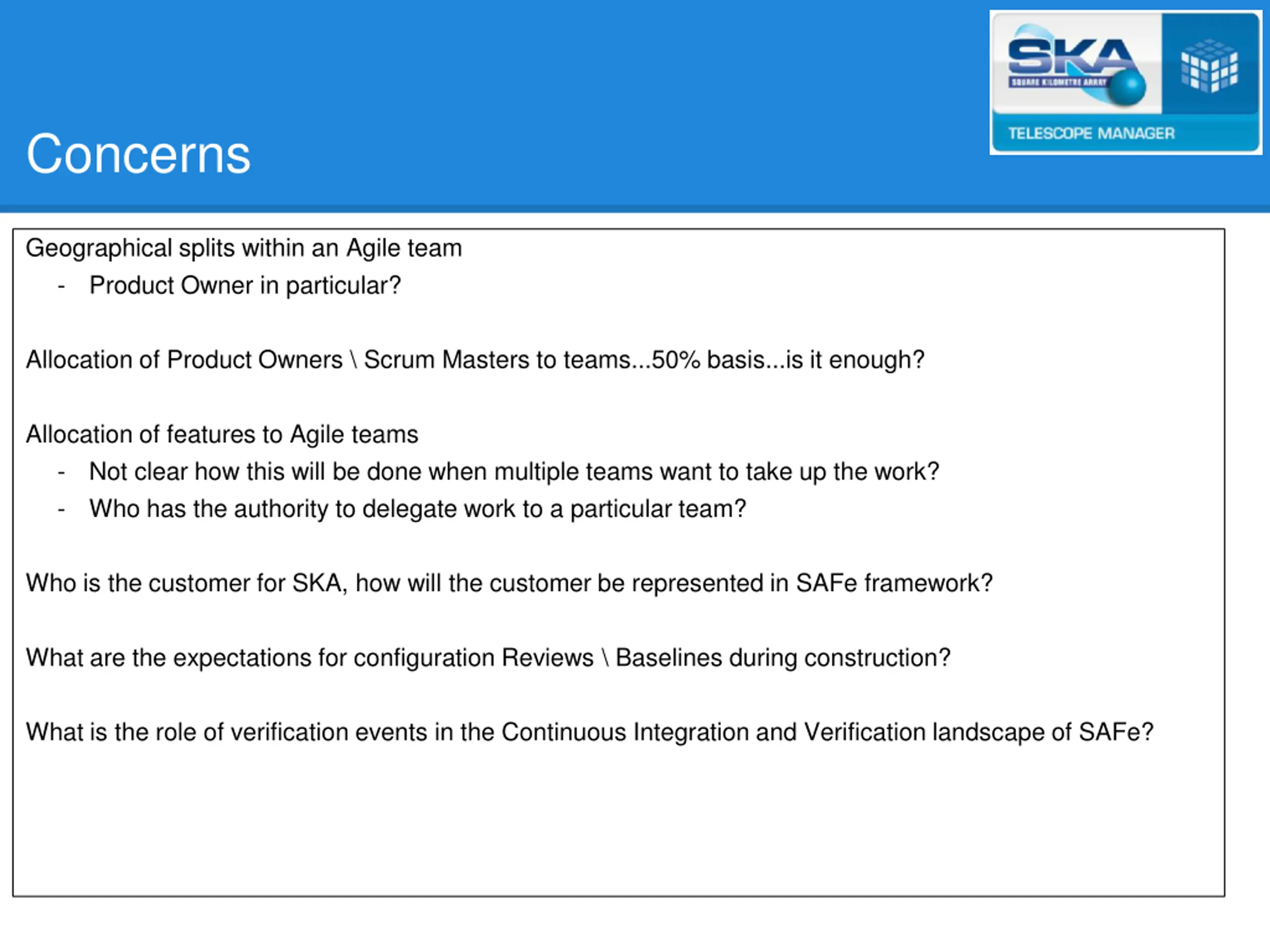 Concerns Geographical splits within an Agile team - Product Owner in particular? Allocation of Product Owners \ Scrum Masters to teams...50% basis...is it enough? Allocation of features to Agile teams - Not clear how this will be done when multiple teams want to take up the work? - Who has the authority to delegate work to a particular team? Who is the customer for SKA, how will the customer be represented in SAFe framework? What are the expectations for configuration Reviews \ Baselines during construction? What is the role of verification events in the Continuous Integration and Verification landscape of SAFe?
