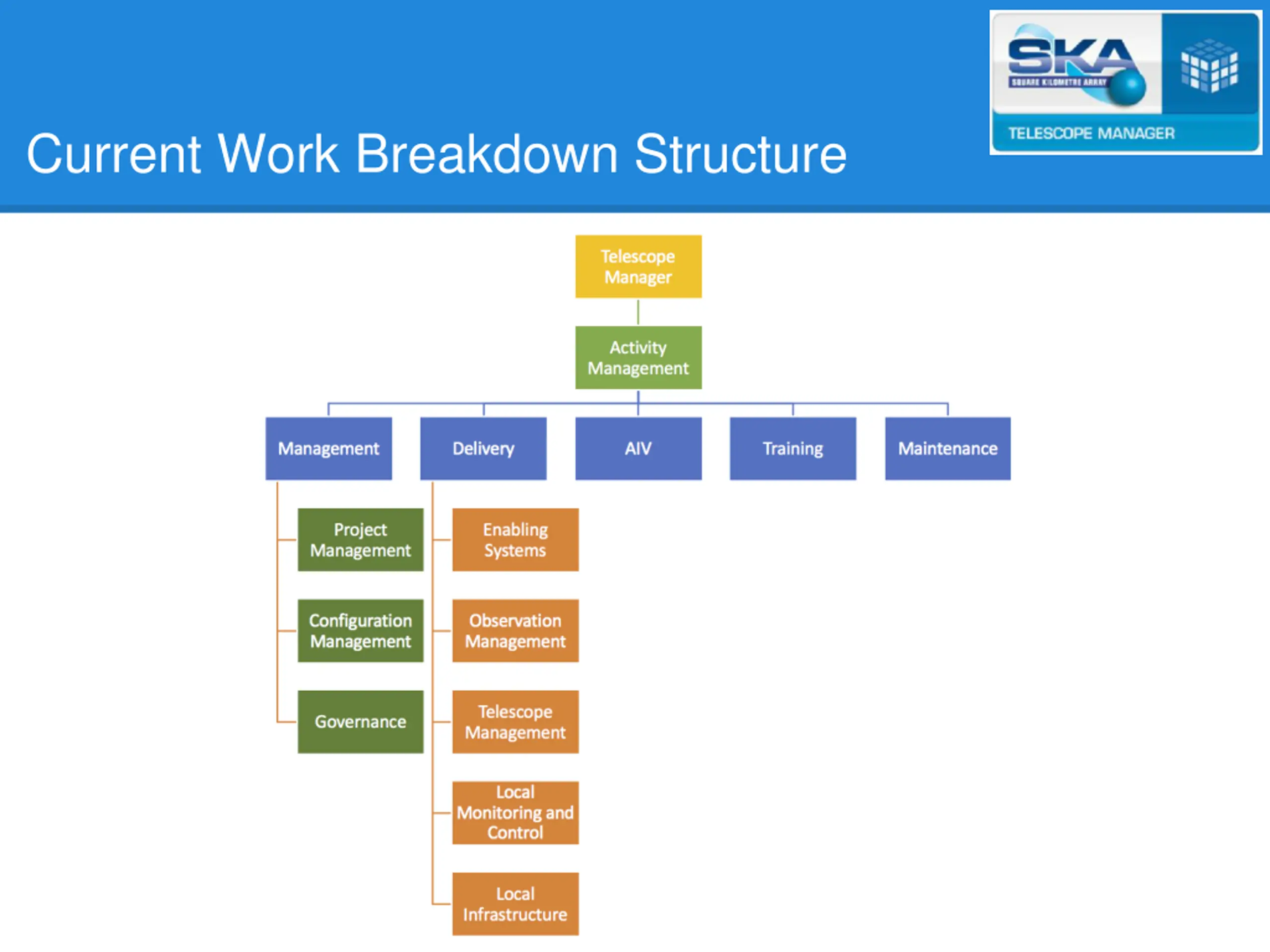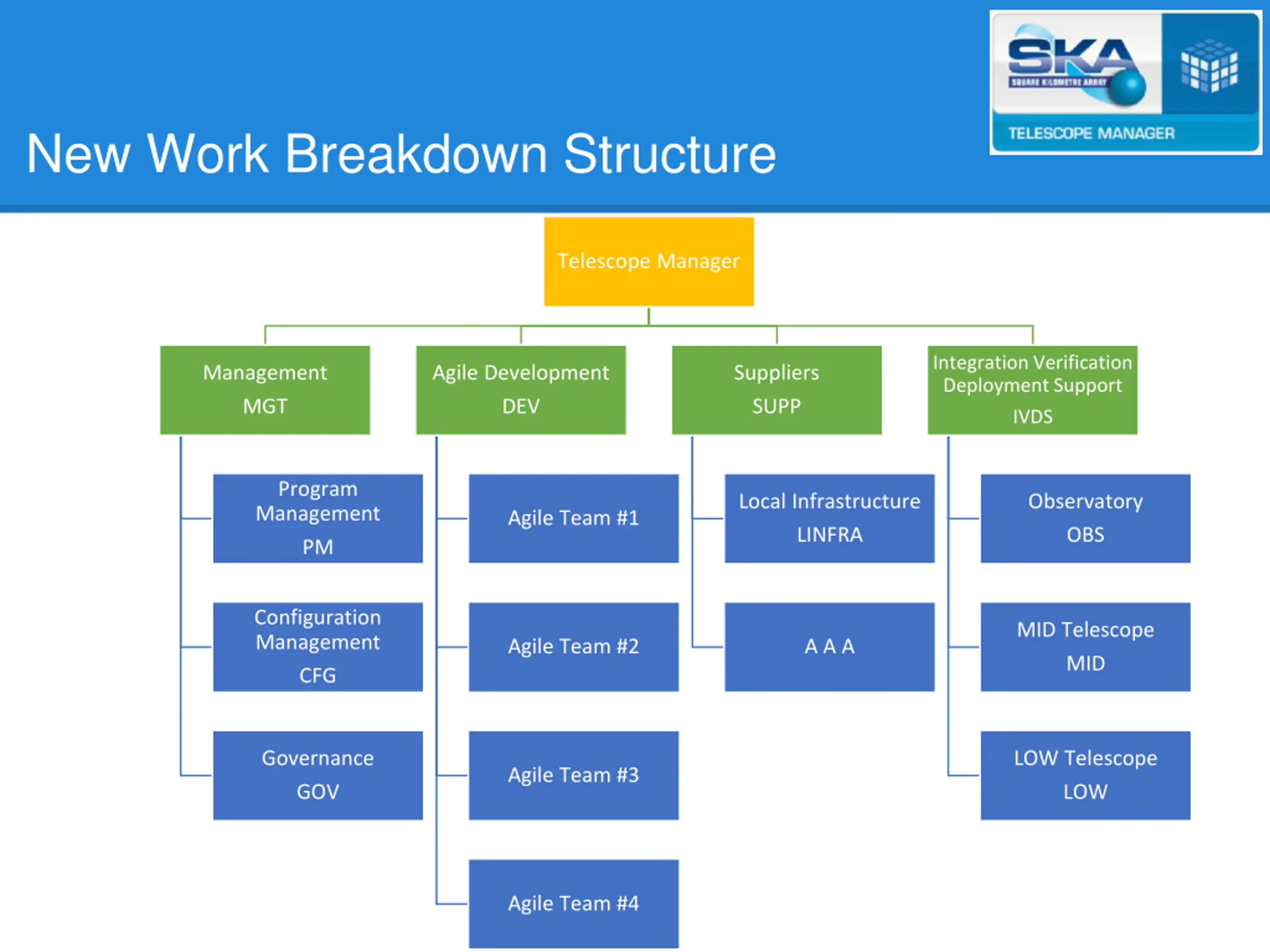 New Work Breakdown Structure Telescope Manager Integration Verification Deployment Support IVDS Management MGT Agile Development DEV Suppliers SUPP Program Management PM Local Infrastructure LINFRA Observatory OBS Agile Team #1 Configuration Management CFG MID Telescope MID Agile Team #2 A A A Governance GOV LOW Telescope LOW Agile Team #3 Agile Team #4
