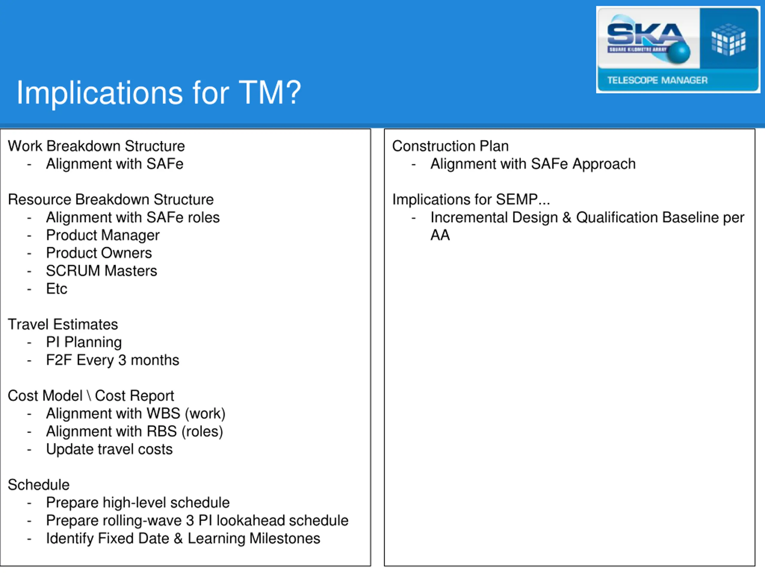 Implications for TM? Work Breakdown Structure - Alignment with SAFe Construction Plan - Alignment with SAFe Approach Resource Breakdown Structure - Alignment with SAFe roles - Product Manager - Product Owners - SCRUM Masters - Etc Implications for SEMP... - Incremental Design & Qualification Baseline per AA Travel Estimates - PI Planning - F2F Every 3 months Cost Model \ Cost Report - Alignment with WBS (work) - Alignment with RBS (roles) - Update travel costs Schedule - - - Prepare high-level schedule Prepare rolling-wave 3 PI lookahead schedule Identify Fixed Date & Learning Milestones