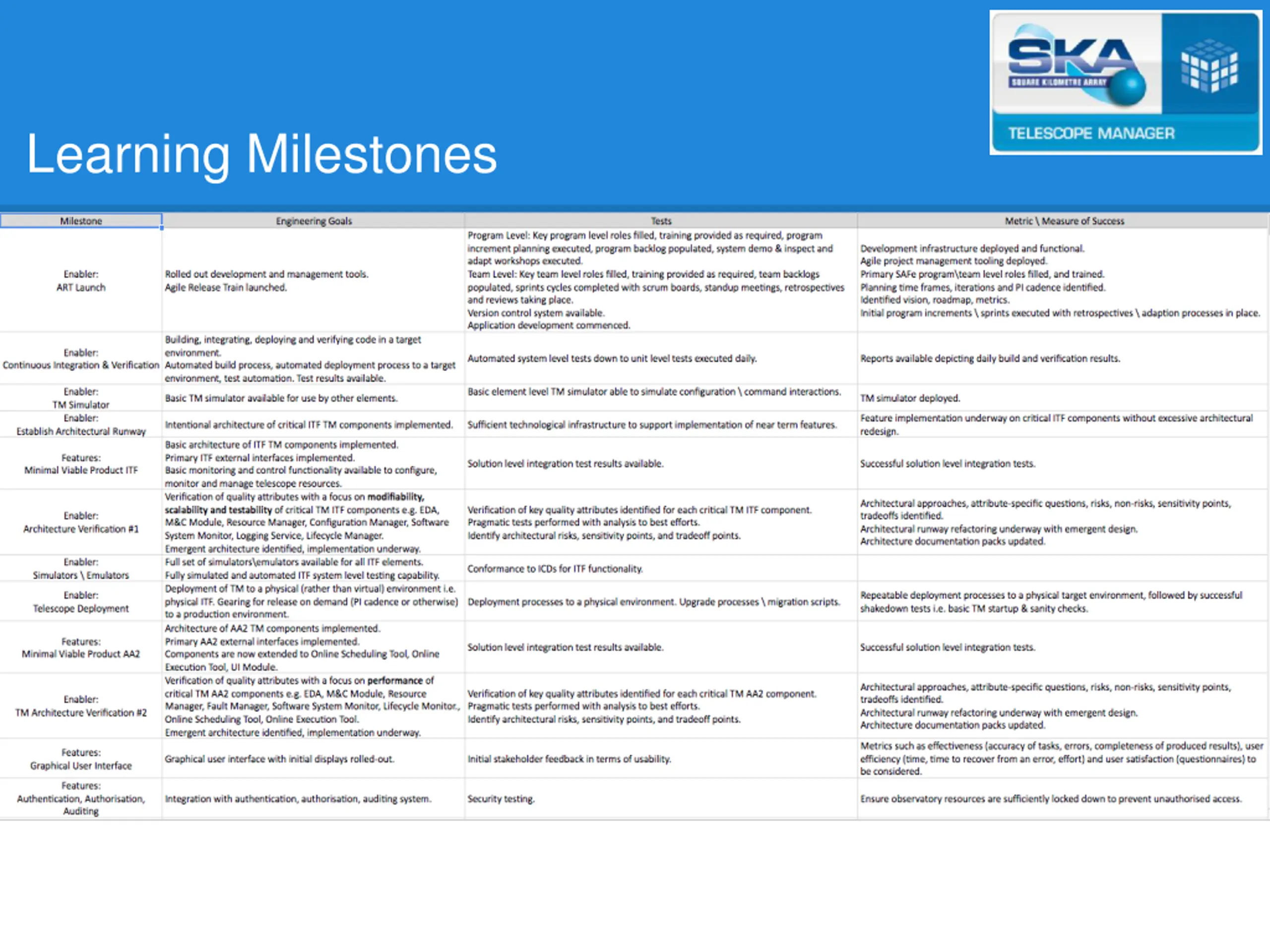 Learning Milestones Milestone Engineering Goals Tests Metric \ Measure of Success Program Level: Key program level roles filled, training provided as required, program increment planning executed, program backlog populated, system demo & inspect and adapt workshops executed. Team Level: Key team level roles filled, training provided as required, team backlogs populated, sprints cycles completed with scrum boards, standup meetings, retrospectives and reviews taking place. Version control system available. Application development commenced. Development infrastructure deployed and functional. Agile project management tooling deployed. Primary SAFe program\team level roles filled, and trained. Planning time frames, iterations and PI cadence identified. Identified vision, roadmap, metrics. Initial program increments \ sprints executed with retrospectives \ adaption processes in place. Rolled out development and management tools. Agile Release Train launched. Enabler: ART Launch Building, integrating, deploying and verifying code in a target environment. Automated build process, automated deployment process to a target environment, test automation. Test results available. Enabler: Continuous Integration & Verification Automated system level tests down to unit level tests executed daily. Reports available depicting daily build and verification results.