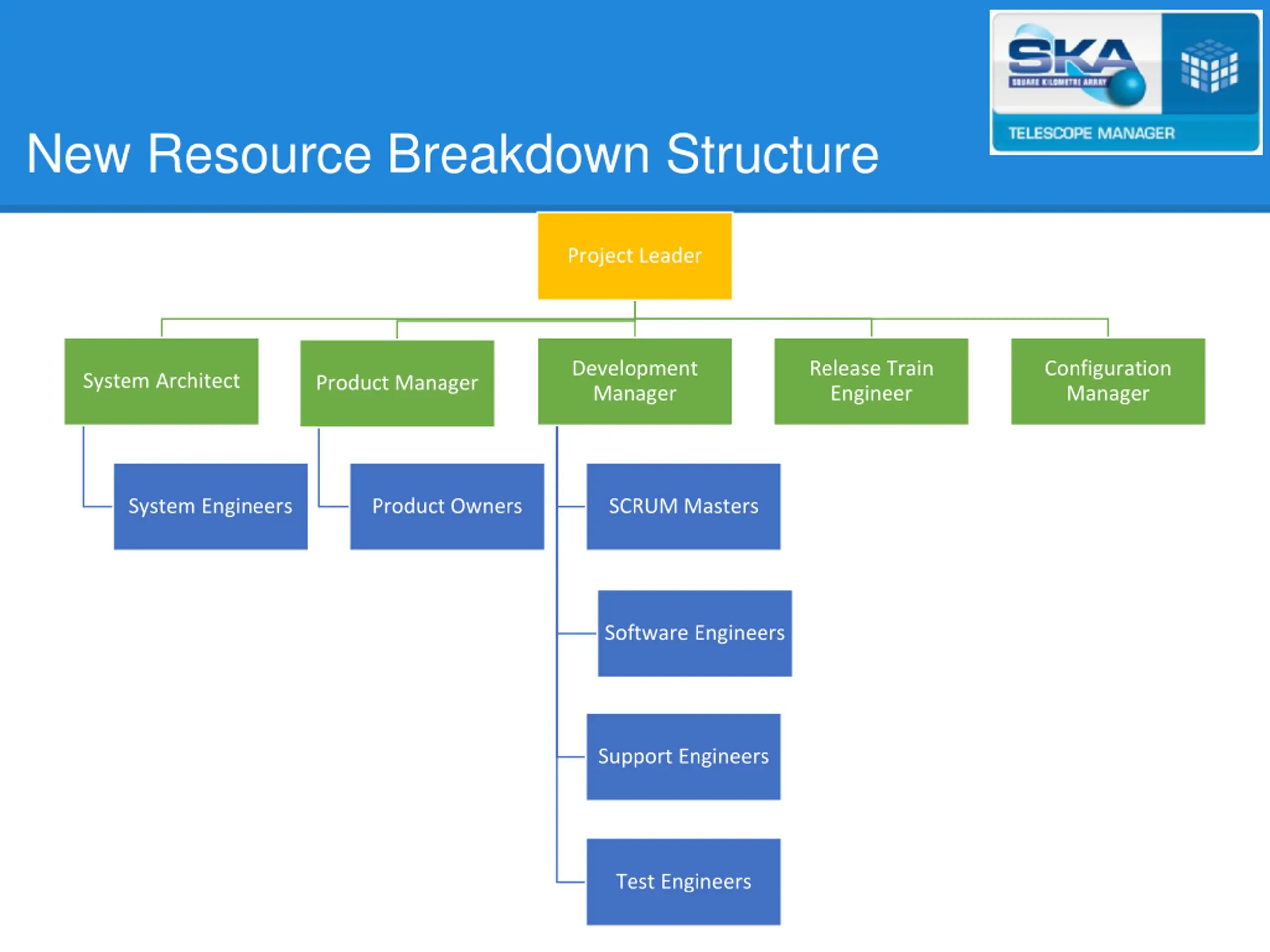 New Resource Breakdown Structure Project Leader Development Manager Release Train Engineer Configuration Manager System Architect Product Manager System Engineers Product Owners SCRUM Masters Software Engineers Support Engineers Test Engineers