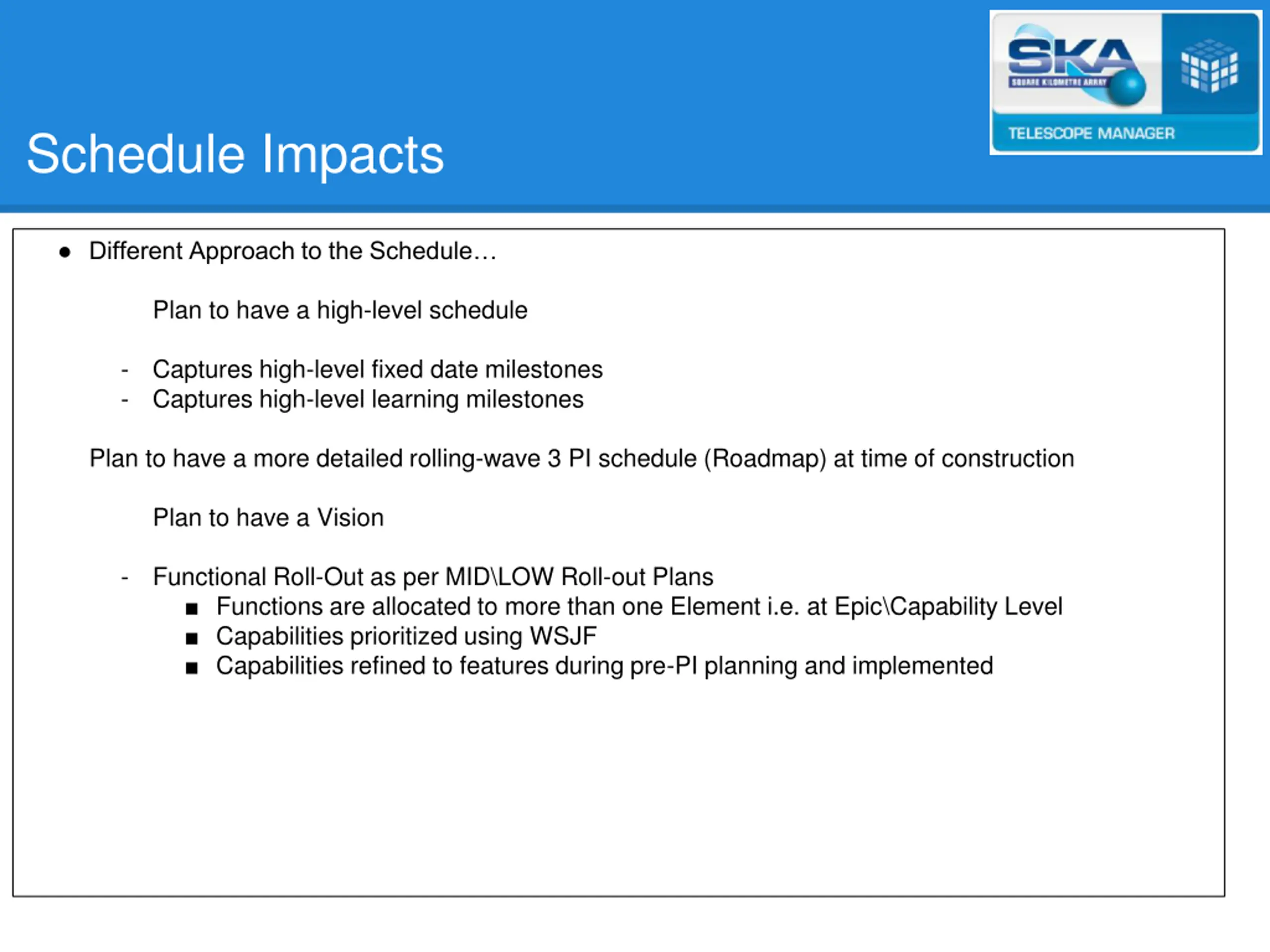 Schedule Impacts Different Approach to the Schedule Plan to have a high-level schedule - - Captures high-level fixed date milestones Captures high-level learning milestones Plan to have a more detailed rolling-wave 3 PI schedule (Roadmap) at time of construction Plan to have a Vision - Functional Roll-Out as per MID\LOW Roll-out Plans Functions are allocated to more than one Element i.e. at Epic\Capability Level Capabilities prioritized using WSJF Capabilities refined to features during pre-PI planning and implemented