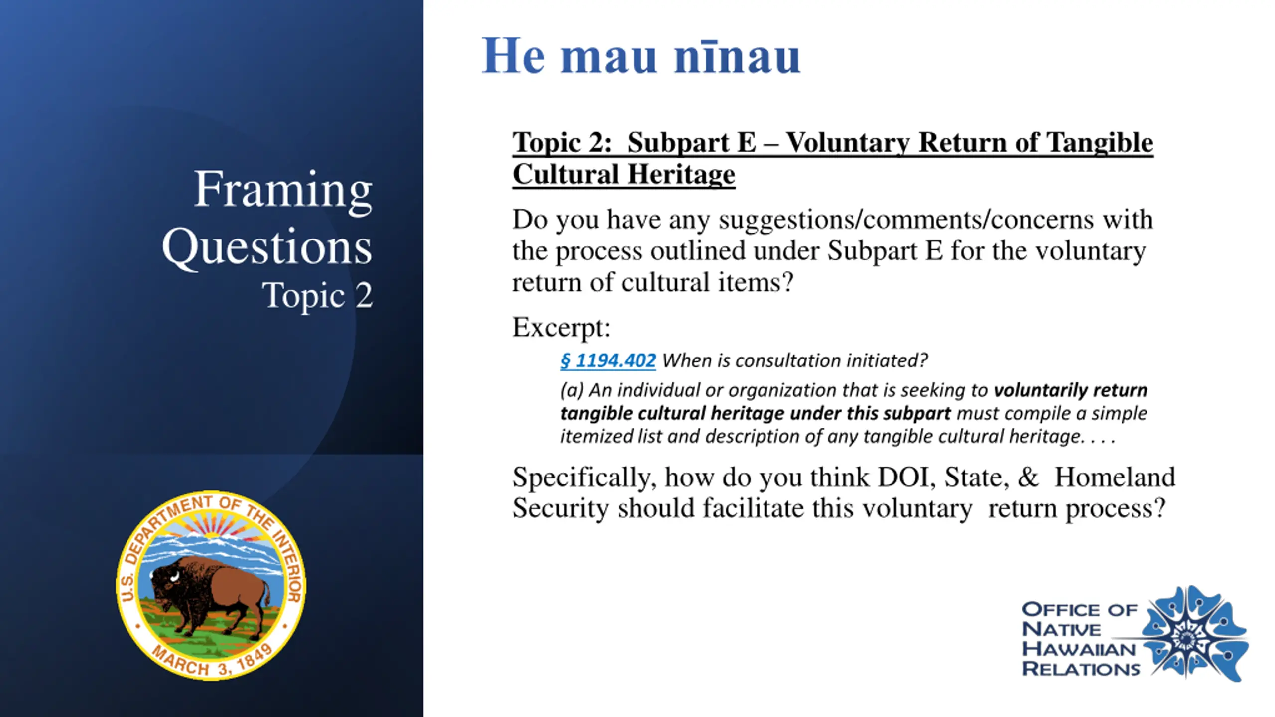 He mau nnau Topic 2:Subpart E Voluntary Return of Tangible Cultural Heritage Do you have any suggestions/comments/concerns with the process outlined under Subpart E for the voluntary return of cultural items? Excerpt: 1194.402 When is consultation initiated? (a) An individual or organization that is seeking to voluntarily return tangible cultural heritage under this subpart must compile a simple itemized list and description of any tangible cultural heritage. . . . Specifically, how do you think DOI, State, & Homeland Security should facilitate this voluntary return process? Framing Questions Topic 2