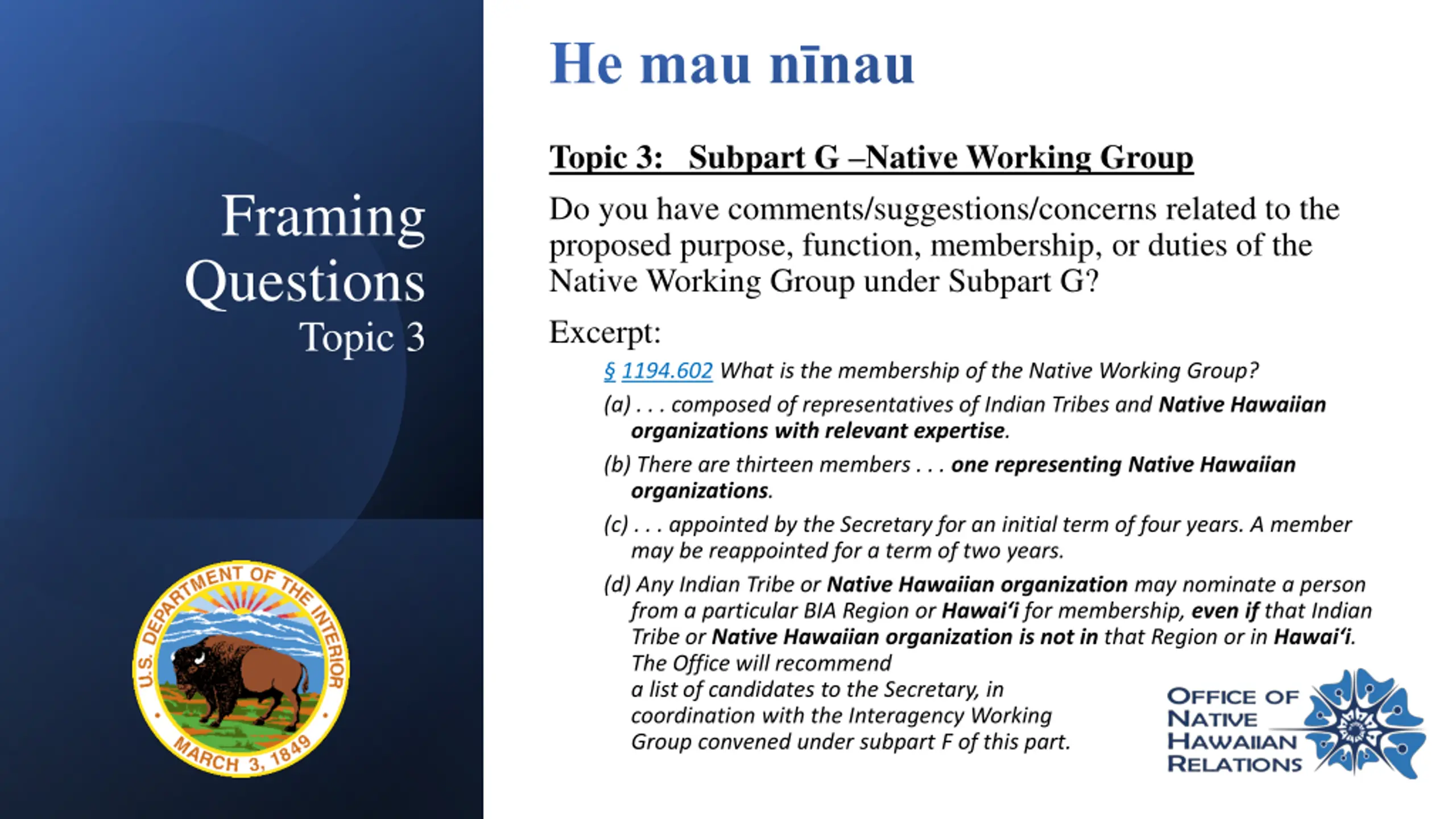 He mau nnau Topic 3:Subpart G Native Working Group Do you have comments/suggestions/concerns related to the proposed purpose, function, membership, or duties of the Native Working Group under Subpart G? Excerpt: 1194.602 What is the membership of the Native Working Group? (a) . . . composed of representatives of Indian Tribes and Native Hawaiian organizations with relevant expertise. (b) There are thirteen members . . . one representing Native Hawaiian organizations. (c) . . . appointed by the Secretary for an initial term of four years. A member may be reappointed for a term of two years. (d) Any Indian Tribe or Native Hawaiian organization may nominate a person from a particular BIA Region or Hawai i for membership, even if that Indian Tribe or Native Hawaiian organizationis not in that Region or in Hawai i. The Office will recommend a list of candidates to the Secretary, in coordination with the Interagency Working Group convened under subpart F of this part. Framing Questions Topic 3