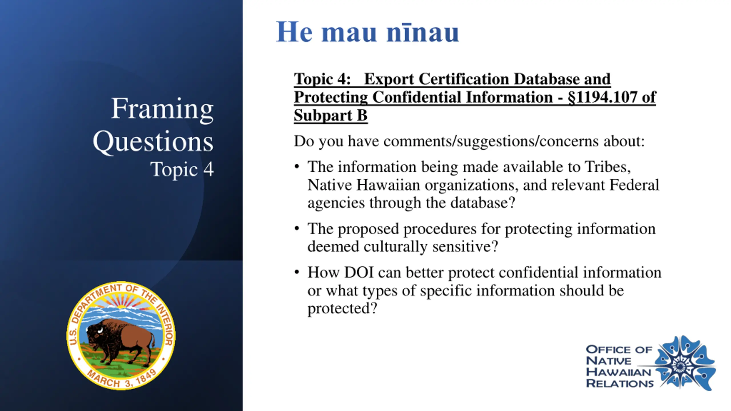 He mau nnau Topic 4: Export Certification Database and Protecting Confidential Information - 1194.107 of Subpart B Do you have comments/suggestions/concerns about: The information being made available to Tribes, Native Hawaiian organizations, and relevant Federal agencies through the database? The proposed procedures for protecting information deemed culturally sensitive? How DOI can better protect confidential information or what types of specific information should be protected? Framing Questions Topic 4