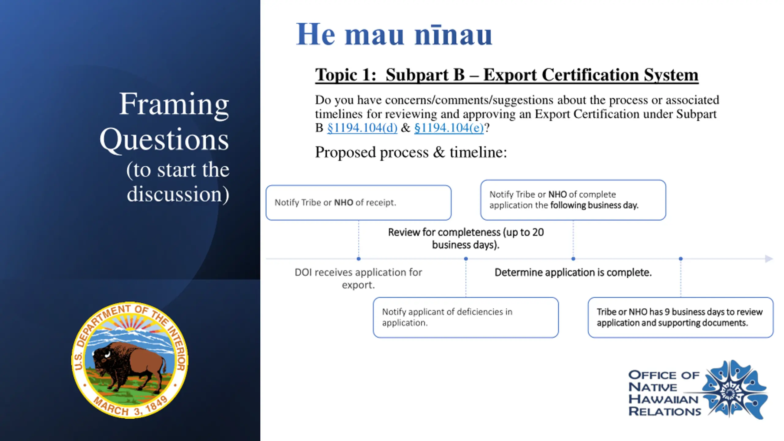 He mau nnau Topic 1: Subpart B Export Certification System Framing Questions (to start the discussion) Do you have concerns/comments/suggestions about the process or associated timelines for reviewing and approving an Export Certification under Subpart B 1194.104(d) & 1194.104(e)? Proposed process & timeline: Notify Tribe or NHO application the following business day. following business day. NHO of complete Notify Tribe or NHO of receipt. Review Reviewfor for completeness (up to 20 completeness (up to 20 business days). business days). DOI receives application for export. Determine application is Determine application is complete. complete. Notify applicant of deficiencies in application. Tribe or NHO has Tribe or NHO has9 business days to review 9 business days to review application and supporting documents. application and supporting documents.
