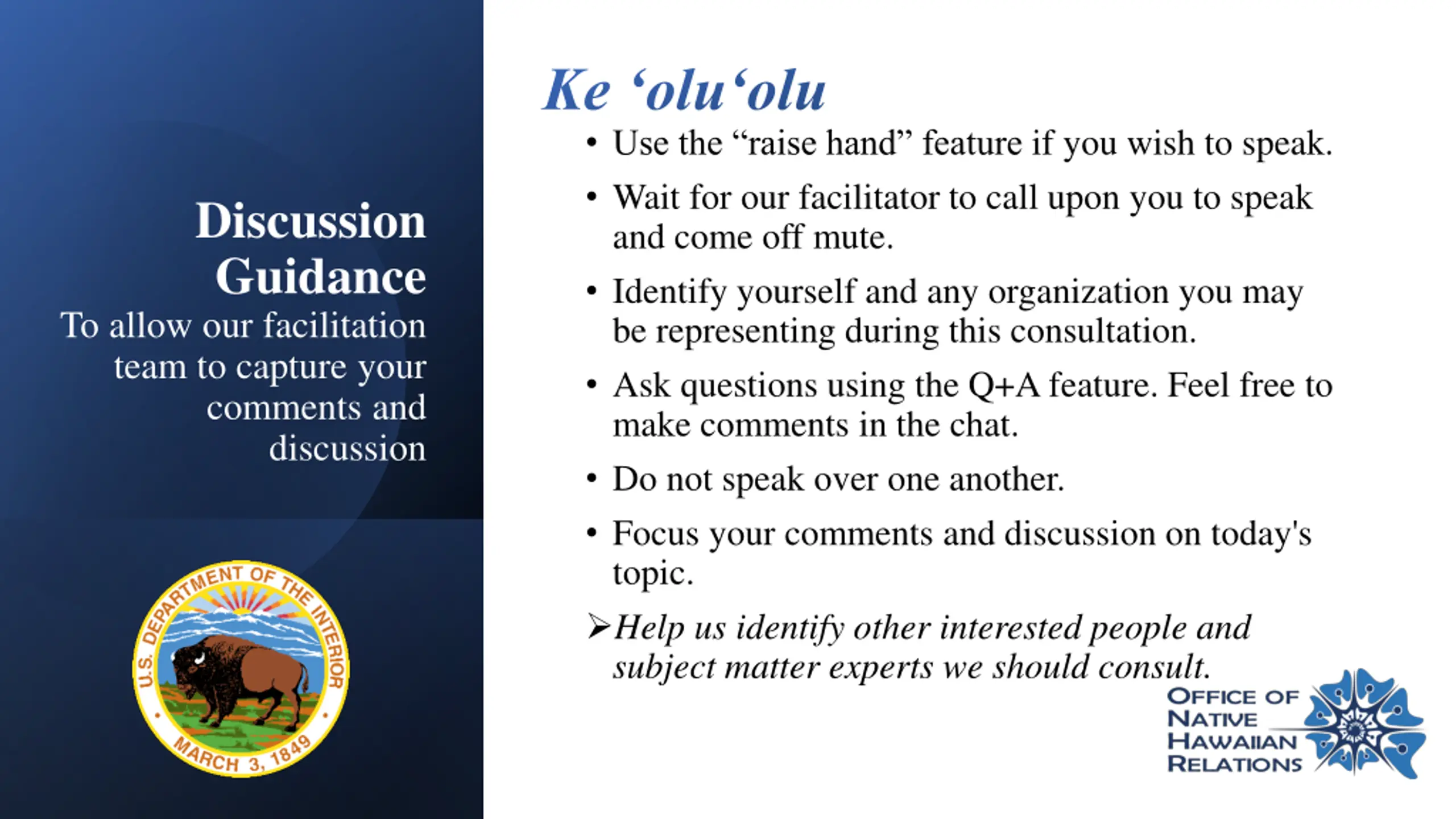 Ke oluolu Use the raise hand feature if you wish to speak. Wait for our facilitator to call upon you to speak and come off mute. Identify yourself and any organization you may be representing during this consultation. Ask questions using the Q+A feature. Feel free to make comments in the chat. Do not speak over one another. Focus your comments and discussion on today's topic. Help us identify other interested people and subject matter experts we should consult. Discussion Guidance To allow our facilitation team to capture your comments and discussion