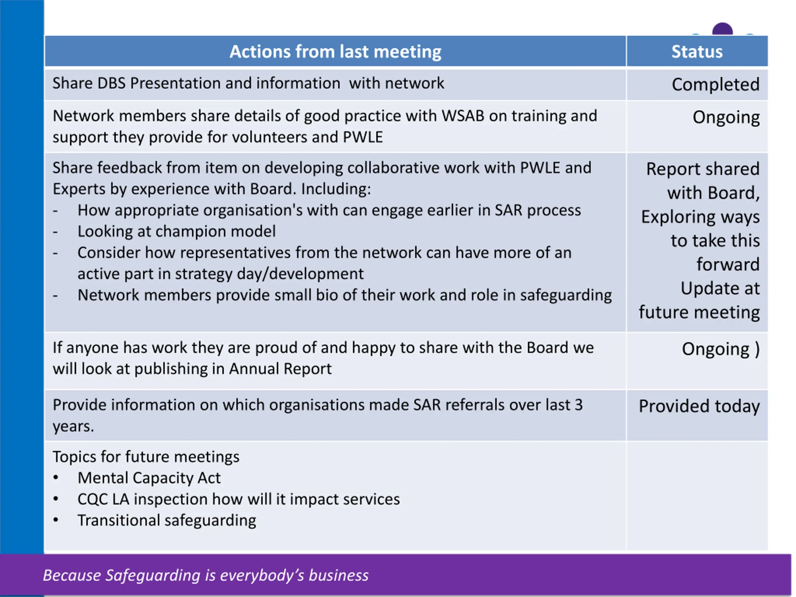 Actions from last meeting Status Share DBS Presentation and information with network Completed Network members share details of good practice with WSAB on training and support they provide for volunteers and PWLE Ongoing Share feedback from item on developing collaborative work with PWLE and Experts by experience with Board. Including: - How appropriate organisation's with can engage earlier in SAR process - Looking at champion model - Consider how representatives from the network can have more of an active part in strategy day/development - Network members provide small bio of their work and role in safeguarding Report shared with Board, Exploring ways to take this forward Update at future meeting If anyone has work they are proud of and happy to share with the Board we will look at publishing in Annual Report Ongoing ) Provide information on which organisations made SAR referrals over last 3 years. Provided today Topics for future meetings Mental Capacity Act CQC LA inspection how will it impact services Transitional safeguarding Because Safeguarding is everybody s business