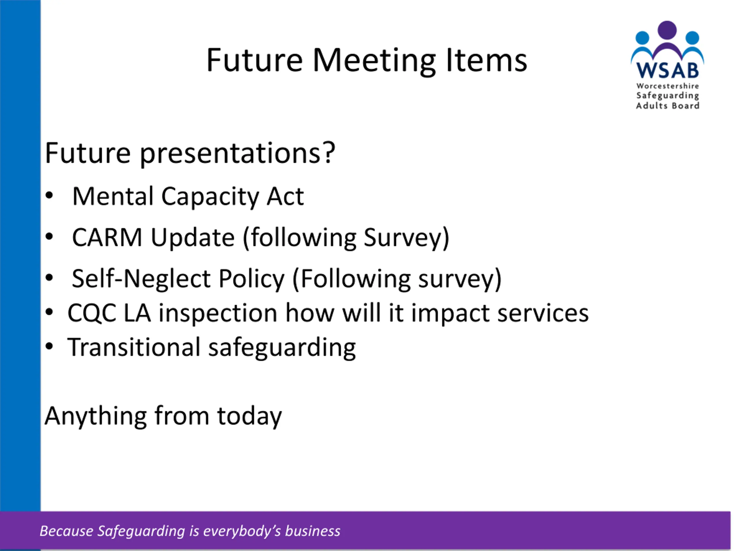 Future Meeting Items Future presentations? Mental Capacity Act CARM Update (following Survey) Self-Neglect Policy (Following survey) CQC LA inspection how will it impact services Transitional safeguarding Anything from today Because Safeguarding is everybody s business
